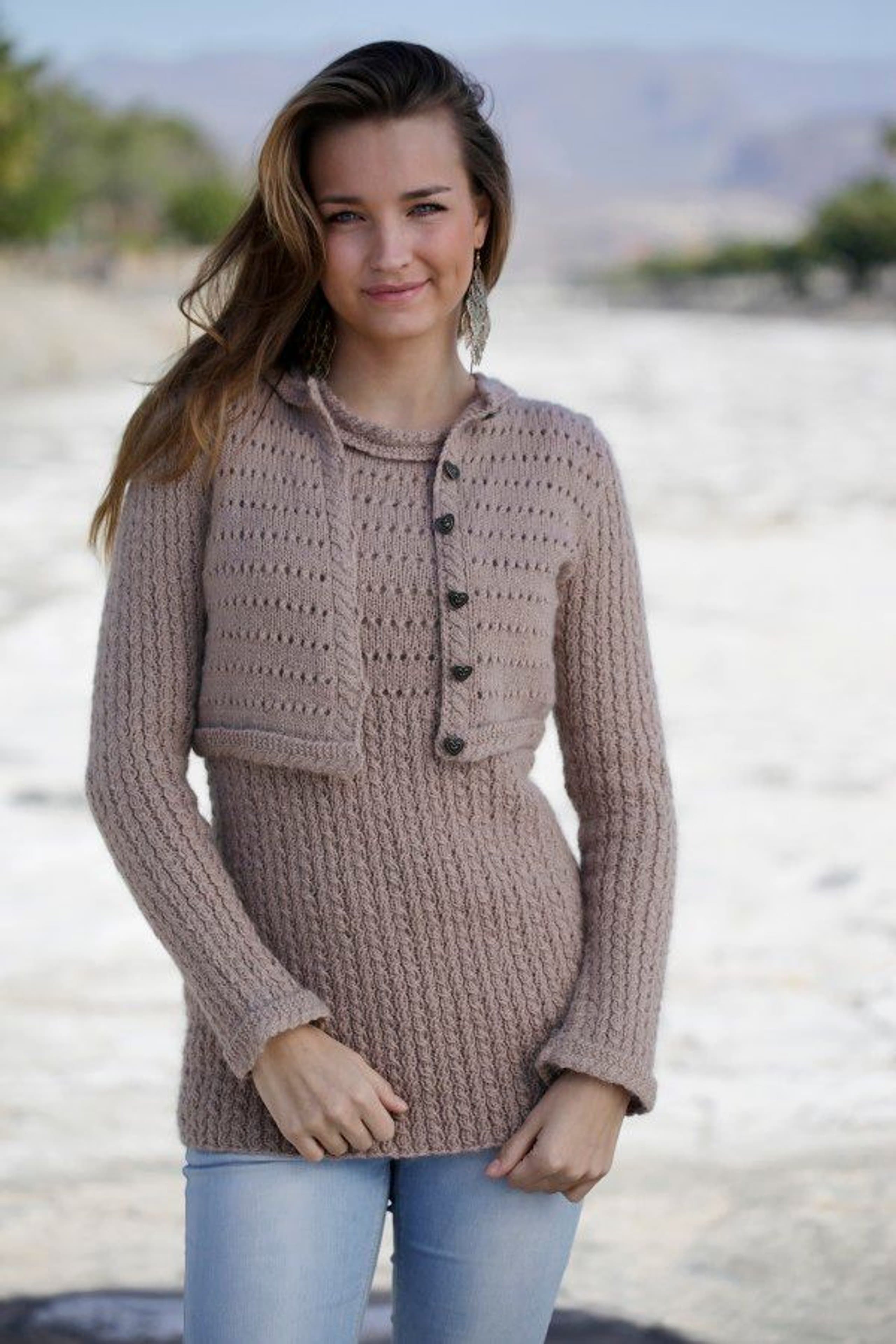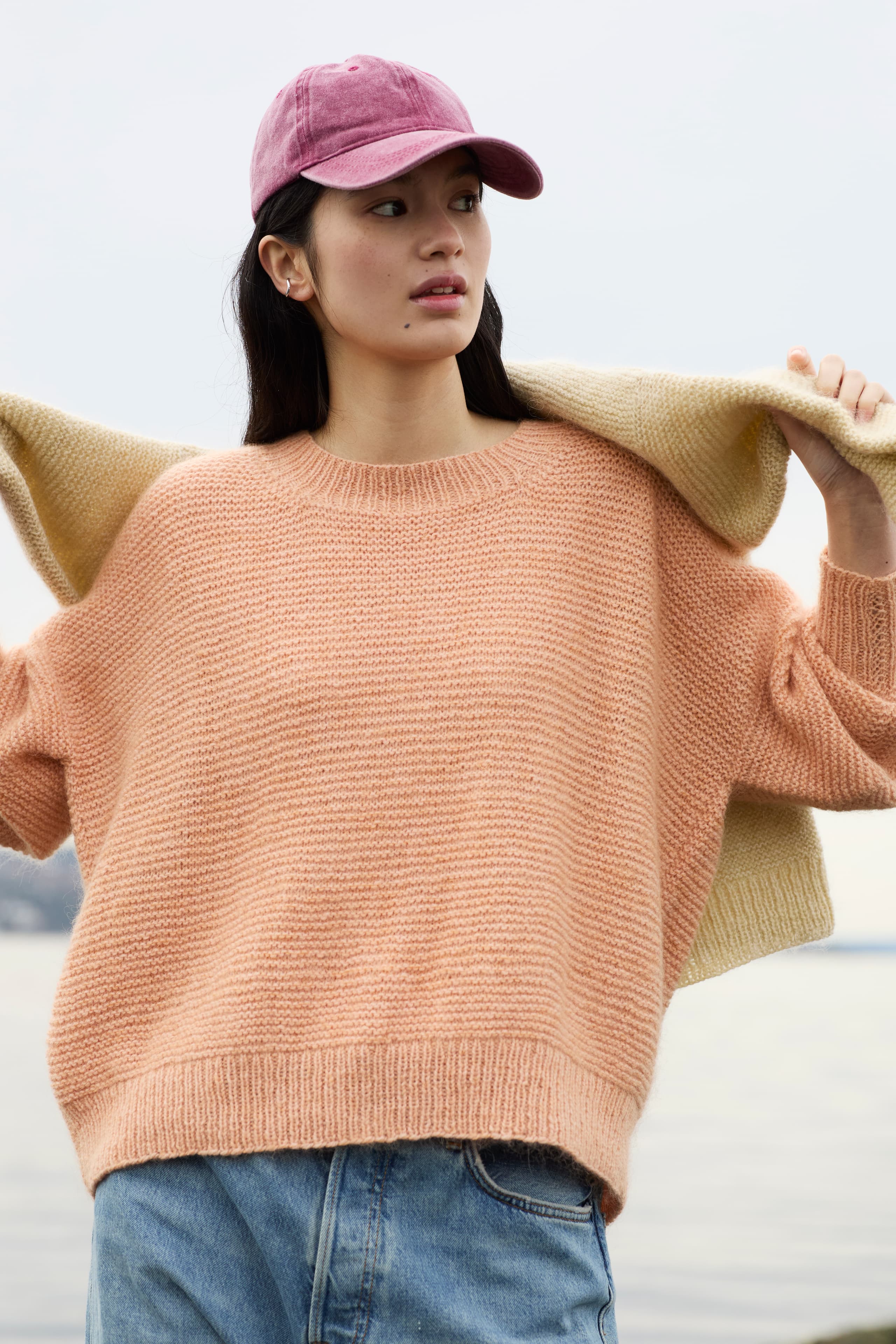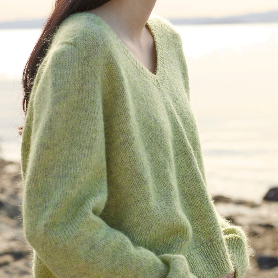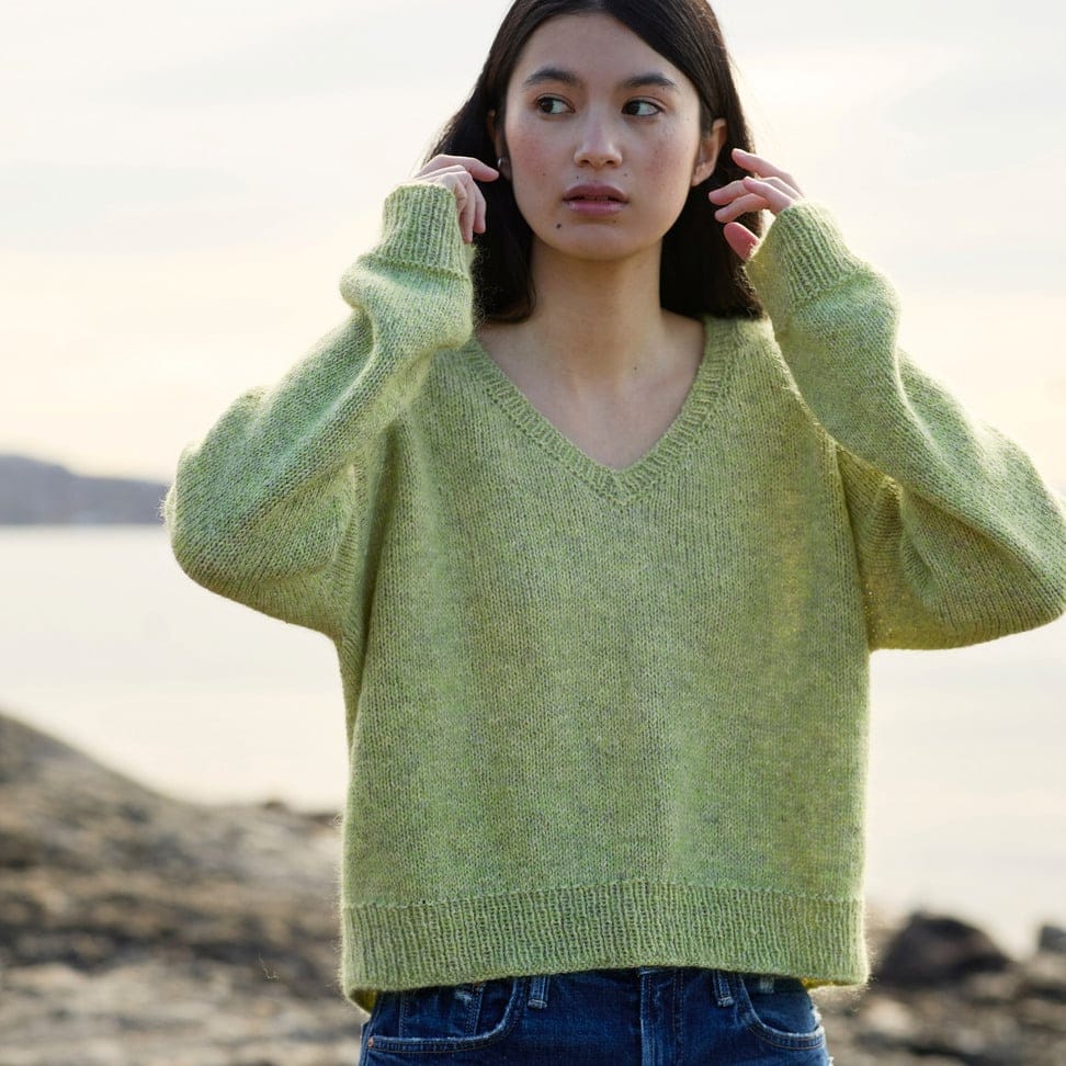 Garnkombinasjoner og forslag til strikkefasthet (p): Husk å strikke prøvelapp. Finull + Plum: 21 m = 10 cm (3,5) Finull + Alpaca Silk: 18 m = 10 cm (4) Finull x 2: 16 m = 10 cm (4,5) Finull x 2 + Plum: 14 m = 10 cm (6) Finull + Plum x 2: 14 m = 10 cm (6) Finull + Alpakka Lin: 14 m = 10 cm (5,5) Garnalternativer: Tumi Pt 5 Petunia Pelini