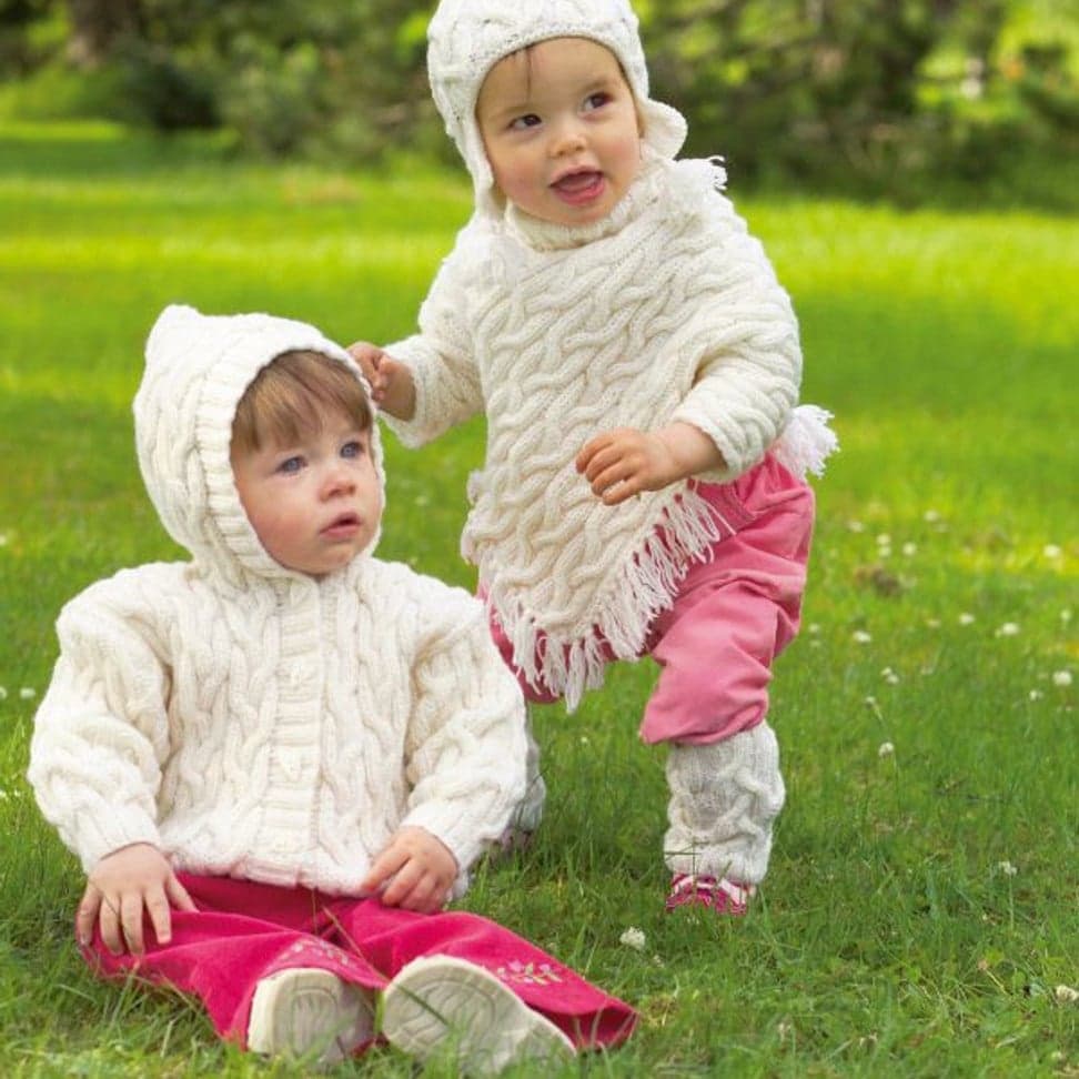 Jakke med hette, genser, lue, leggvarmere og poncho med ermer