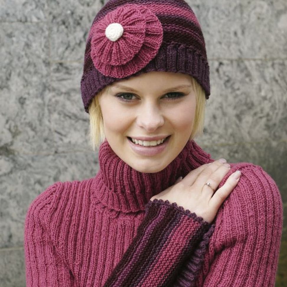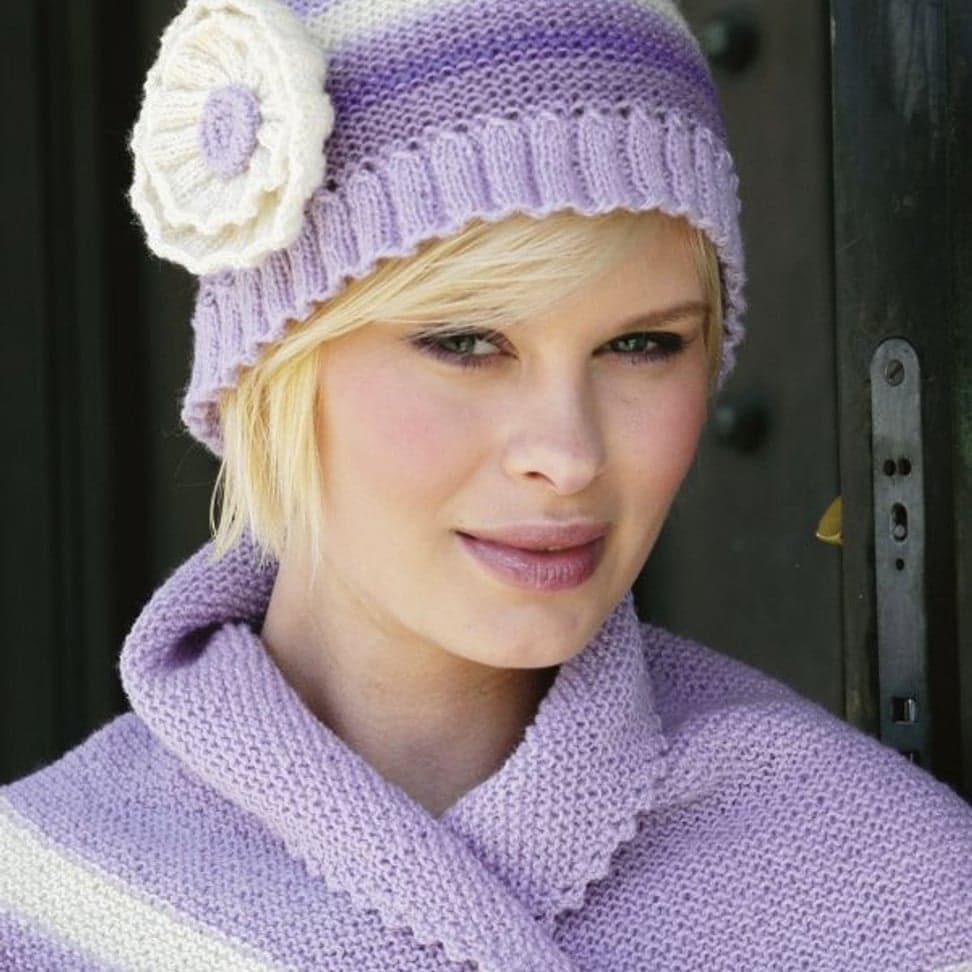 063R-1 - Genser, stripet sjal, lue med rosett og pulsvarmere - Lue og pulsvarmere, alt 2