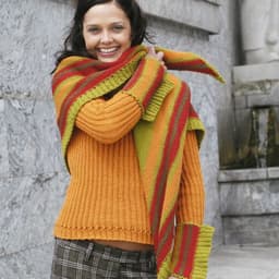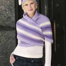 Genser, stripet sjal, lue med rosett og pulsvarmere