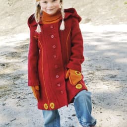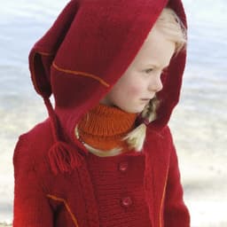 Jakke med rysjer, skjerf, lue med og uten rysjekant