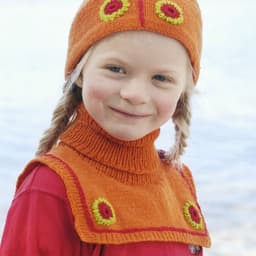 Genser, stripet sjal, lue med rosett og pulsvarmere