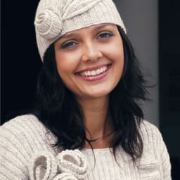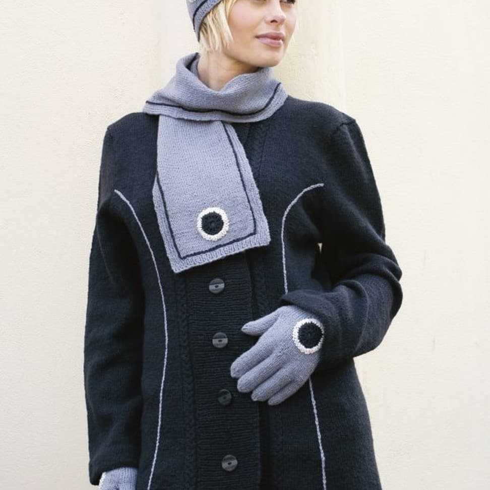 Genser, stripet sjal, lue med rosett og pulsvarmere
