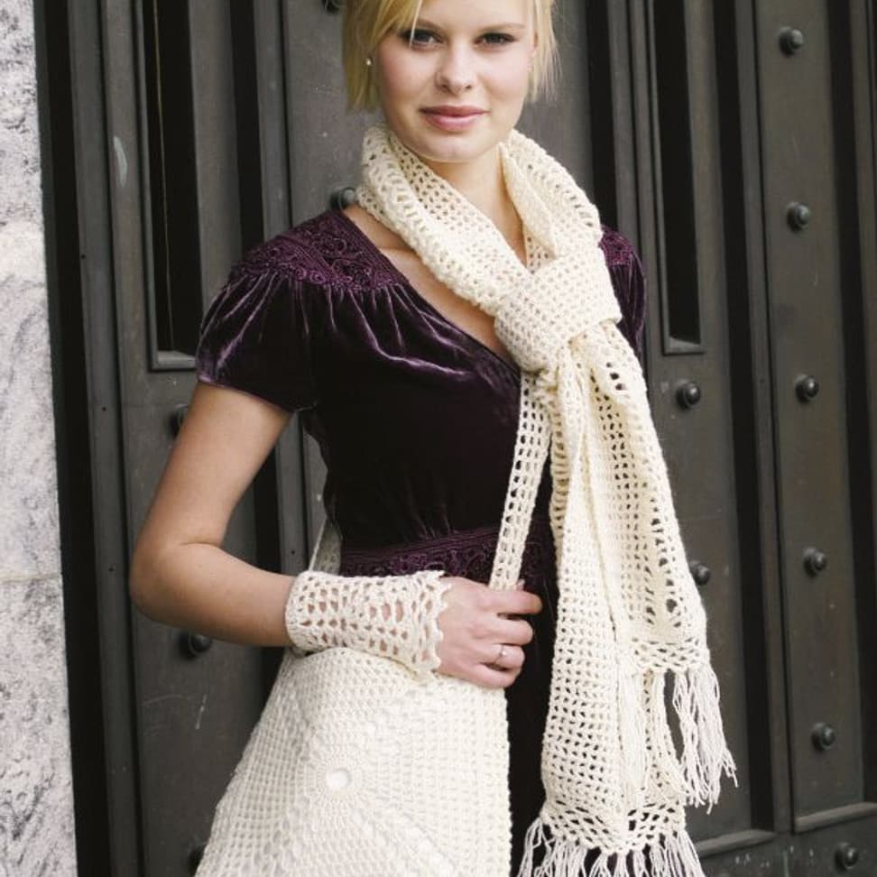 Heklet krage, hals, lue, skjerf, pulsvarmere og veske