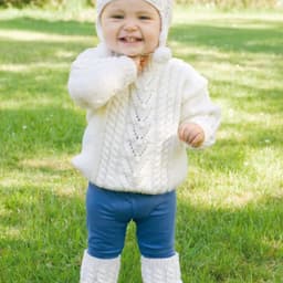 Babysett med hullmønster. Jakke, lue, sokker og sparkebukse.