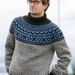 Jakke, gensere og topp med fletter og striper, lue og votter