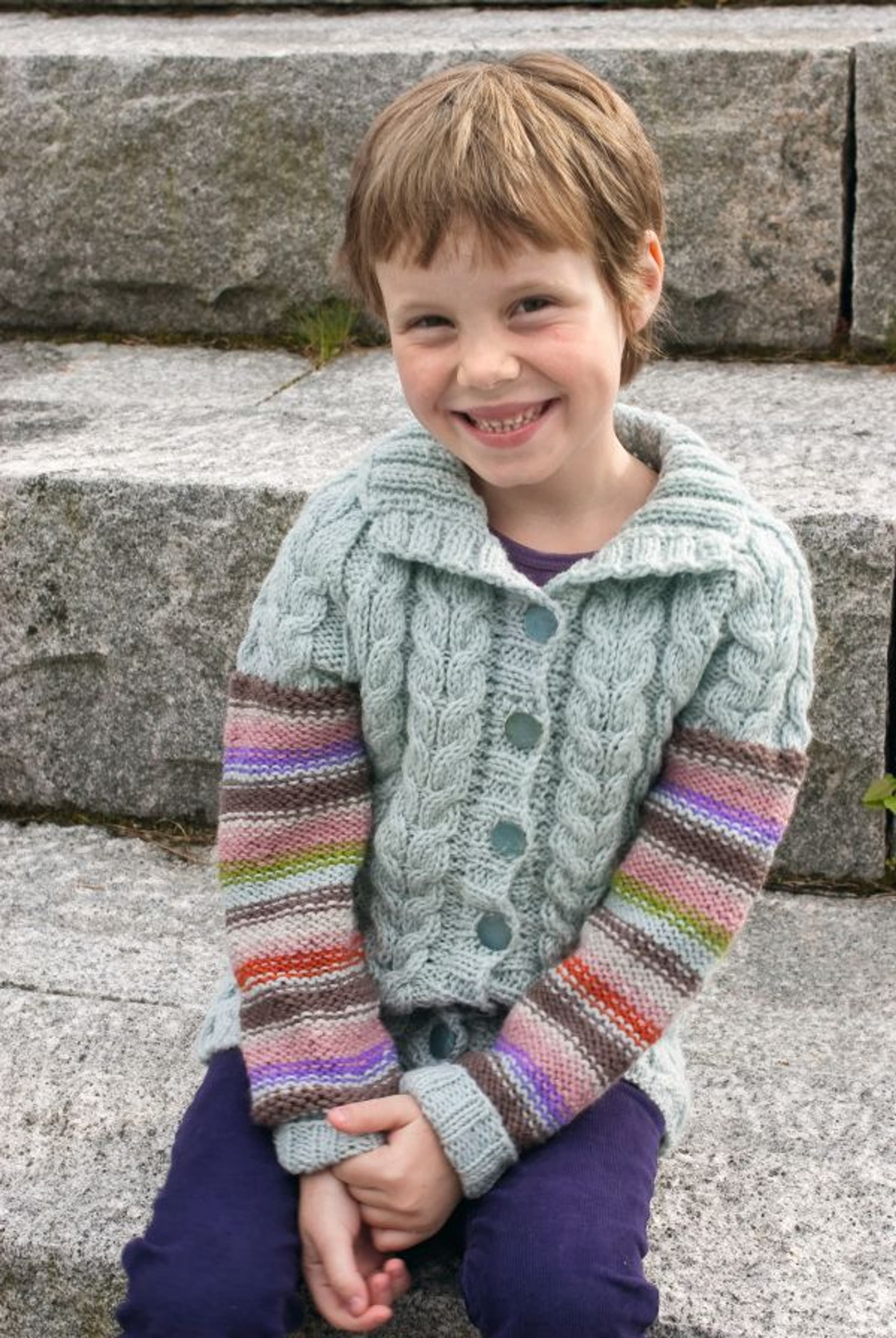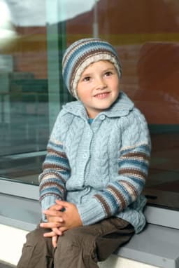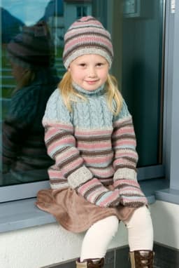 Jakke, genser, lue og votter med fletter og striper