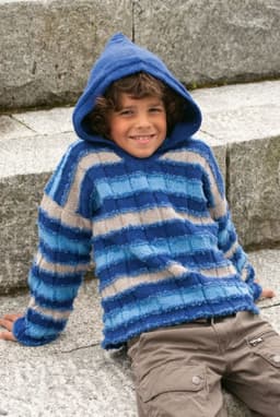 Jakke, genser, lue og votter med fletter og striper
