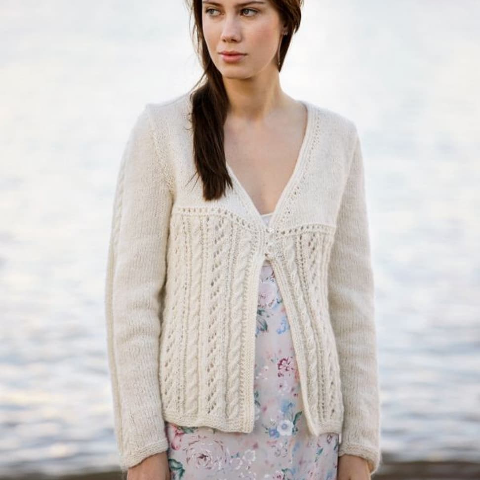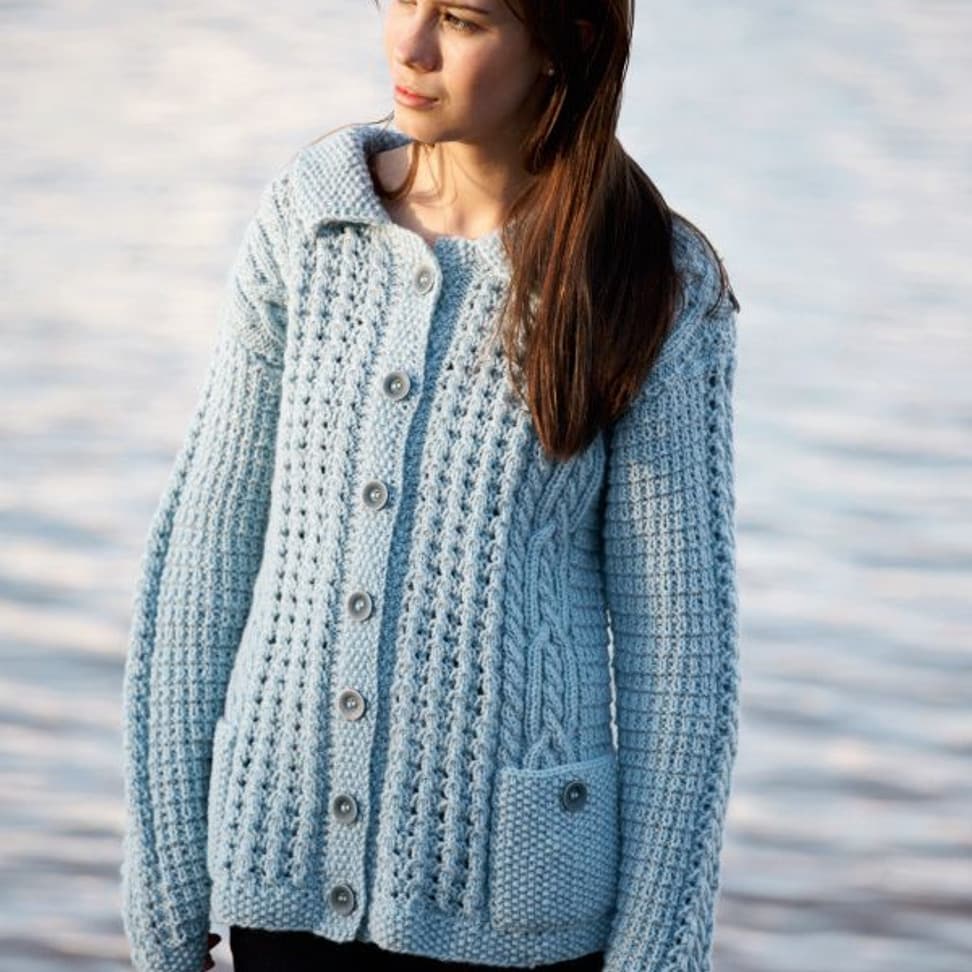 Damejakke med strukturstrikk og fletter, med hette eller halskant