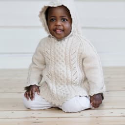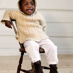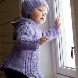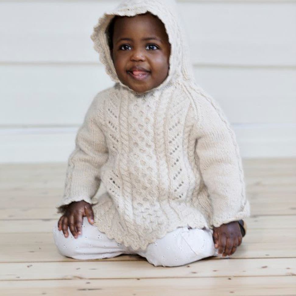 Stripet, kortermet genser med rundt bærestykke, og lue