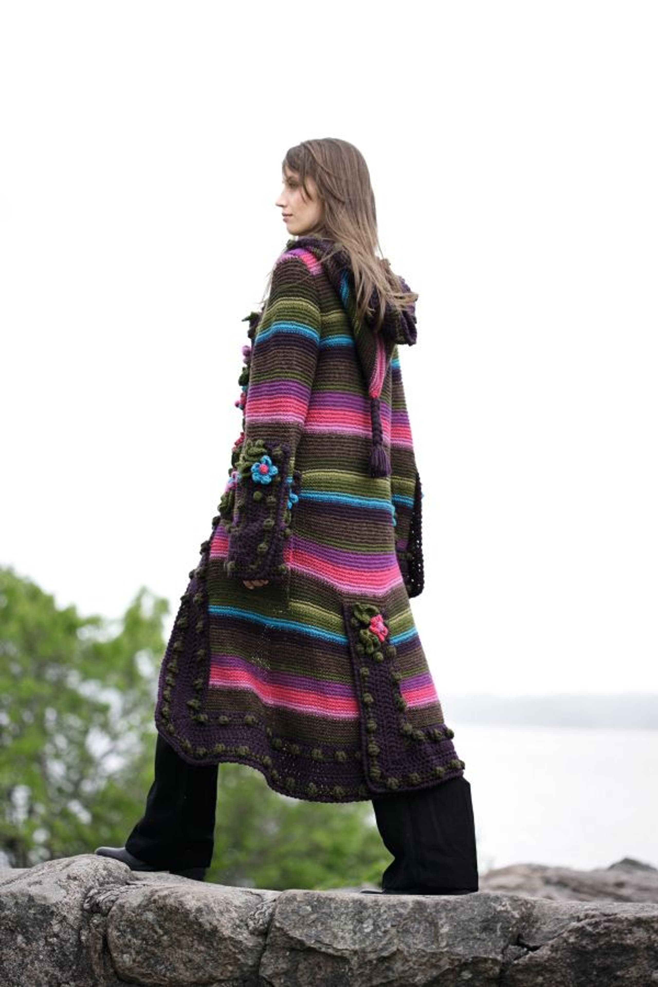 Skuldervarmer med høy hals eller "hette" og lange pulsvarmere