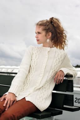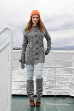 Jakke med flettemønster, votter og leggvarmere