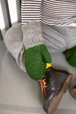 Praktiske rillestrikkede votter med et langt ribbestrikket skaft som holder votten godt på plass. Votten er strikket frem og tilbake og sydd sammen til slutt - for deg som ikke liker å strikke på 5 pinner! Skaftet er strikket i den tynne babyulla, Baby Panda.