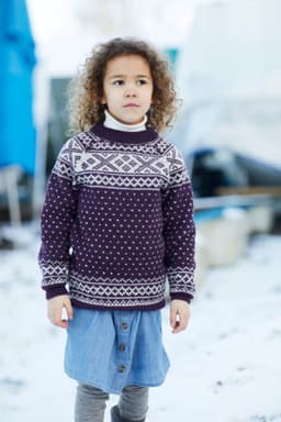 Klassisk mønstret genser til barn. Genseren på bildet er strikket i den utgåtte kvaliteten Petter. Genseren kan imidlertid også strikkes i 3-tråds Strikkegarn eller Mitu. For å velge farge i 3-tråds Strikkegarn, velg "Alt 1: 3-tråds Strikkegarn". For å velge farge i Mitu, velg "Alt 2: Mitu".