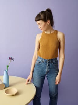 Agathe topp er en helt kroppsnær topp med et enkelt og basic snitt. Forstykket er smalt, med vide ermehull, som gjør at stroppene kommer nærme halsen. Modellen er kort, for å passe til sommerskjørt eller bukser med høyt liv. Agathe topp strikkes nedenfra og opp, og ønsker du den lengre kan du strikke til ønsket lengde før du feller av til ermehull. Toppen er løsere rundt brystet enn hva målene tilsier pga det smale forstykket som gjør at den gir seg. Det anbefales derfor å måle på en smal topp du liker, istedenfor egen overvidde, for å finne rett størrelse.
