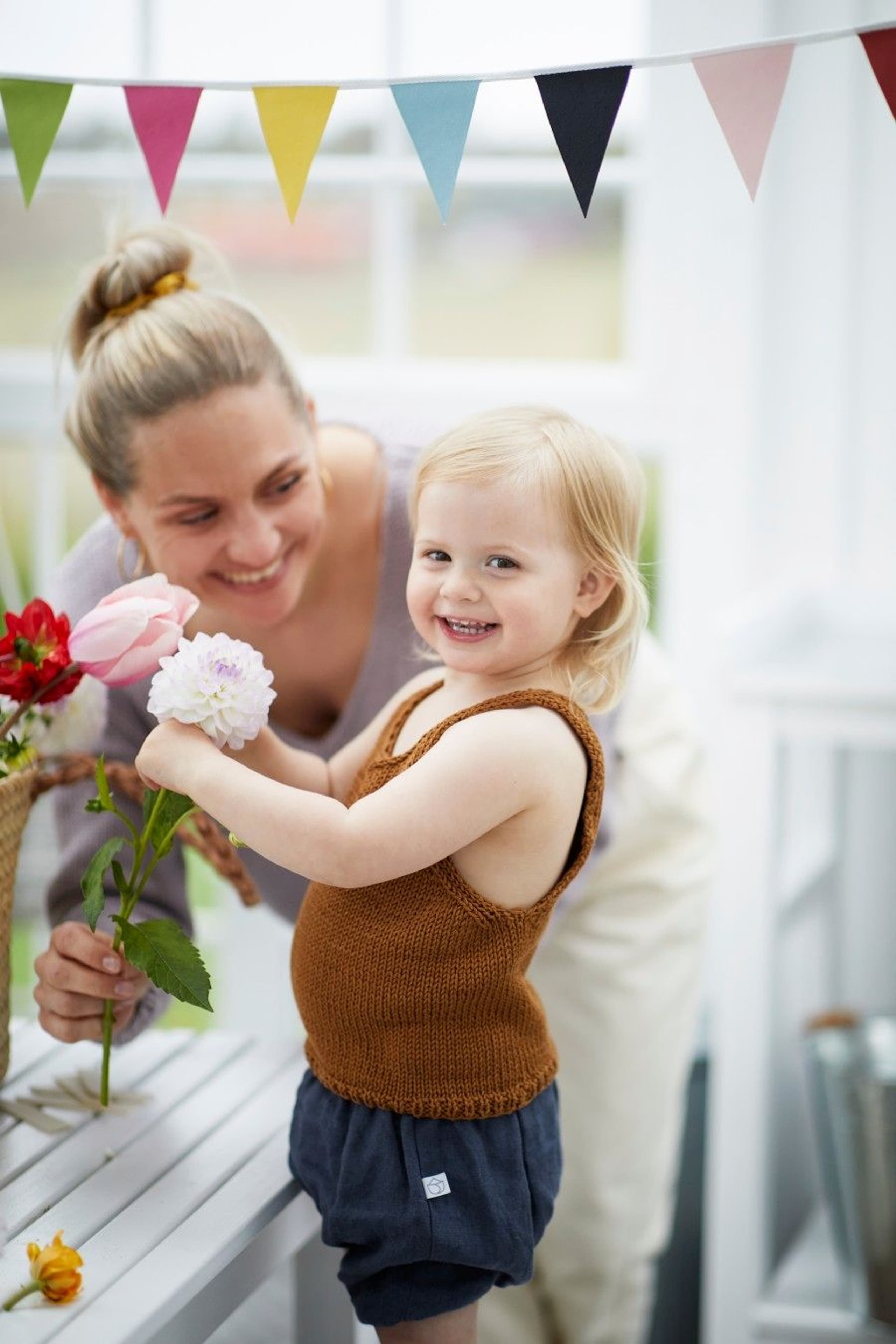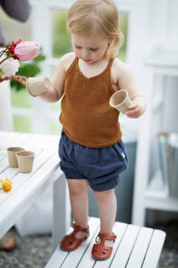 Tuliptoppen har stropper og v-hals både foran og bak. Forstykket begynner bak på ryggen. Bakstykket strikkes uten å felle til ermerigning siden alle fellinger skjer på forstykket.