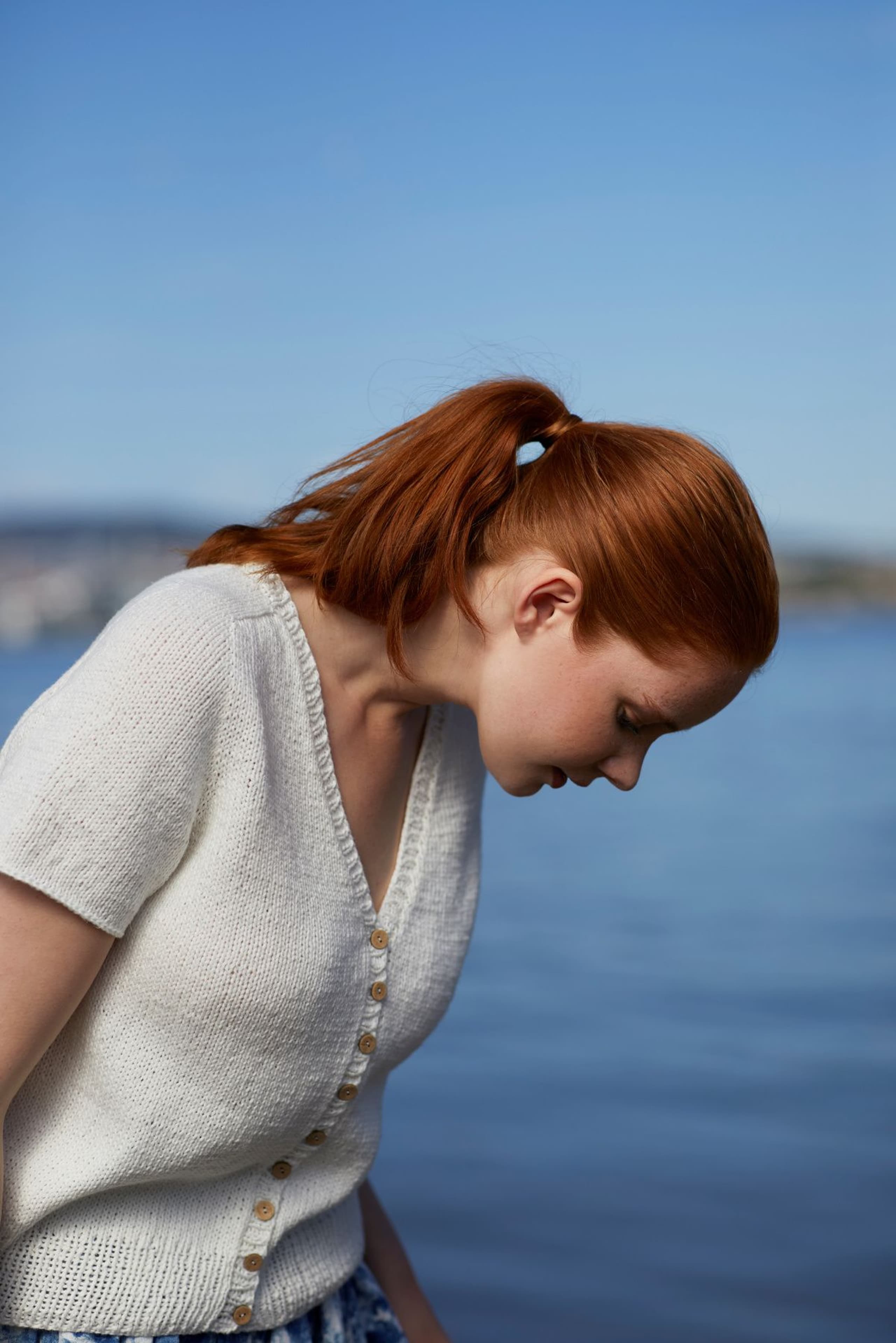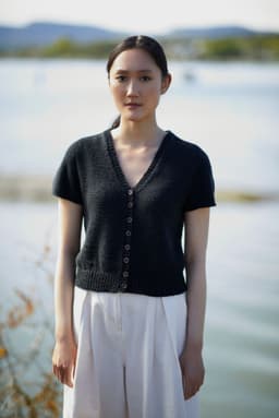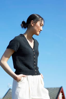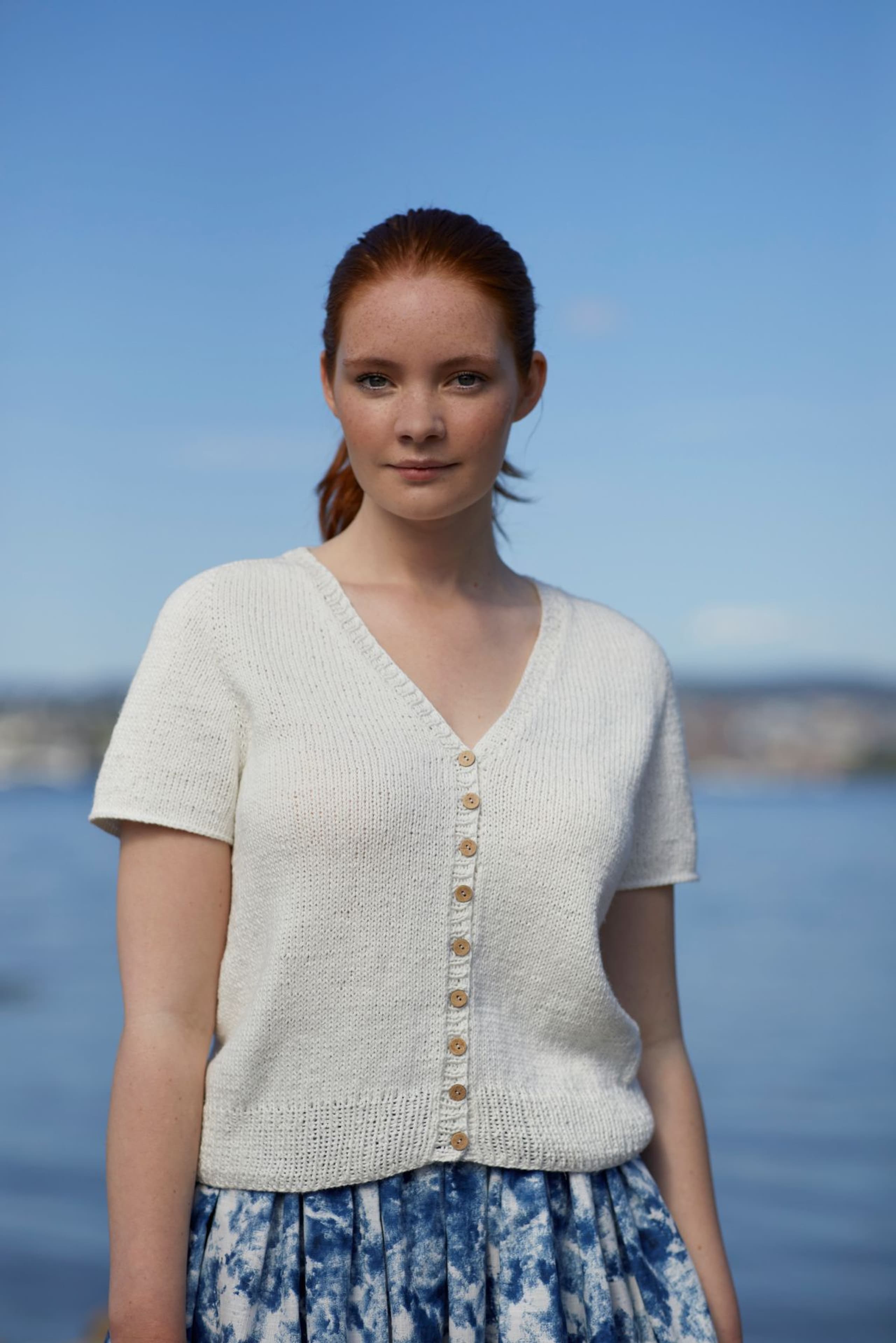Sommerbris knappetopp kan brukes som en t-skjorte eller kortermet jakke. Den strikkes ovenfra og ned med en fin skulder- og ermeøkning.