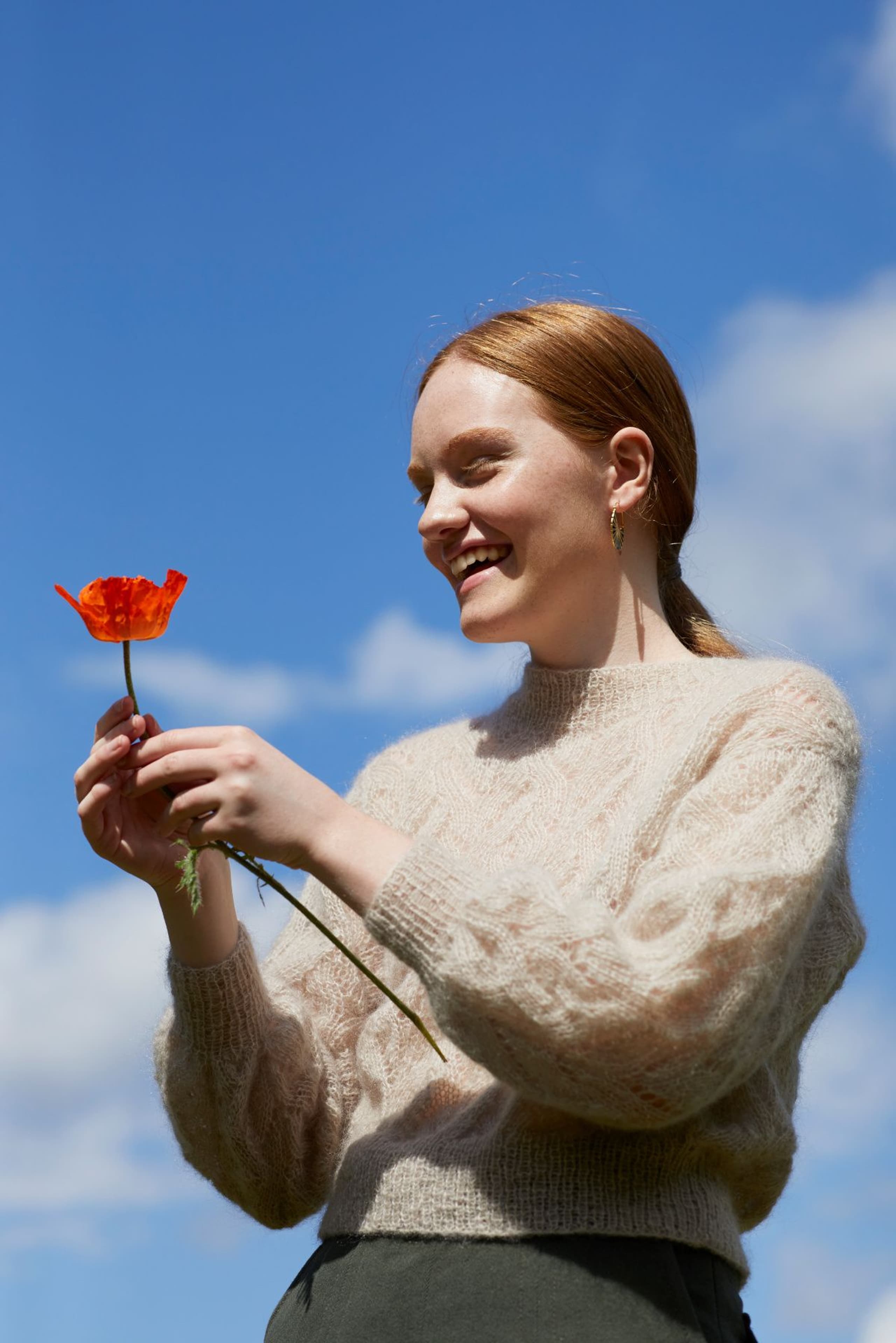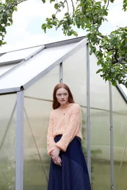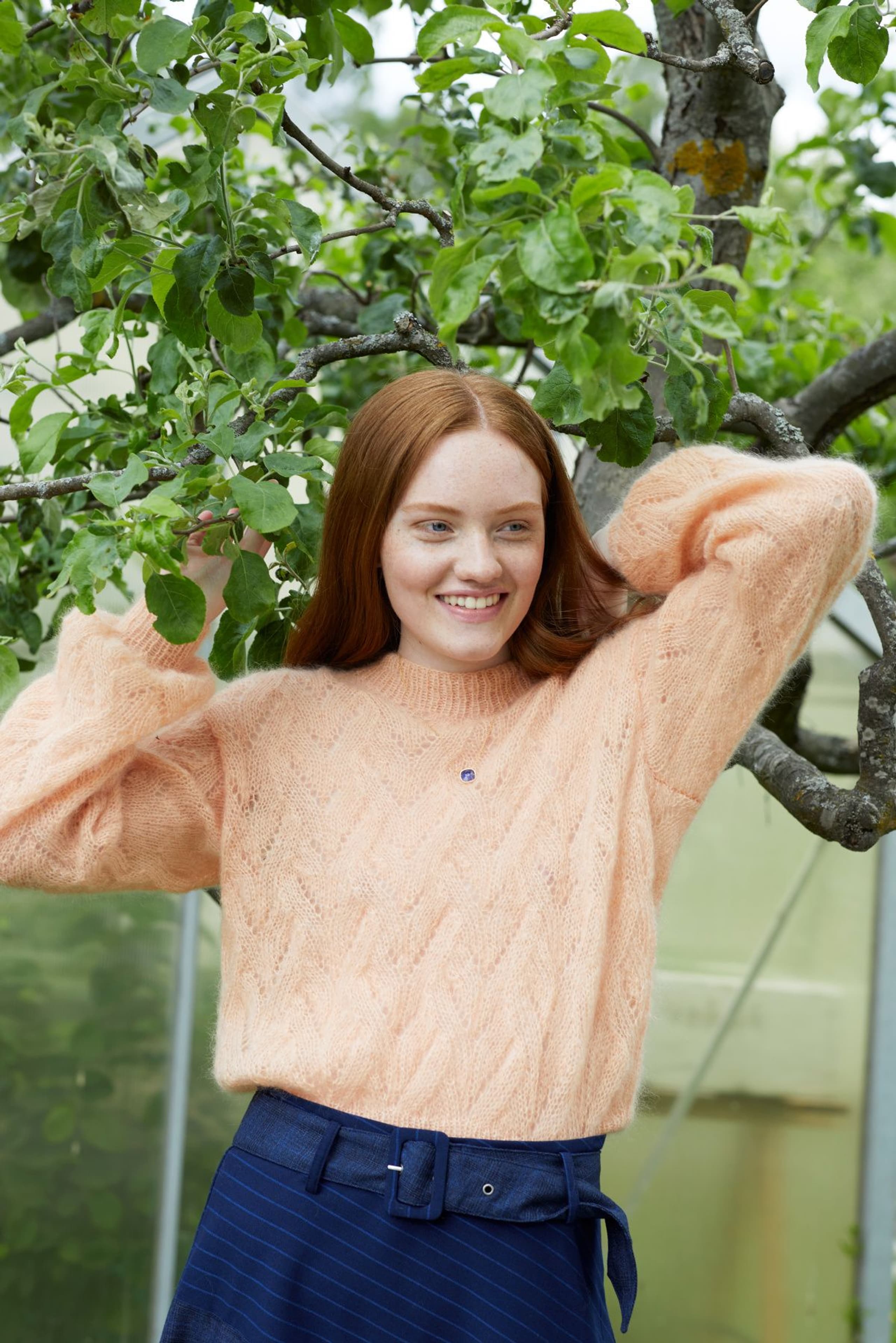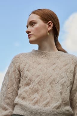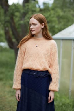Fionagenser har et nydelig og romantisk hullmønster som er veldig gøy å strikke. Den strikkes nedenfra og opp og har isydde ermer. Genseren har en kort passform som passer over en bukse eller et skjørt med høyt liv, eller over en kjole. Ønsker du en lengre passform er det enkelt å strikke bolen litt lengre før det felles til ermehull. Pass i så fall på å beregne litt ekstra garn. Hele genseren strikkes med dobbel tråd.