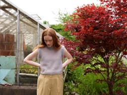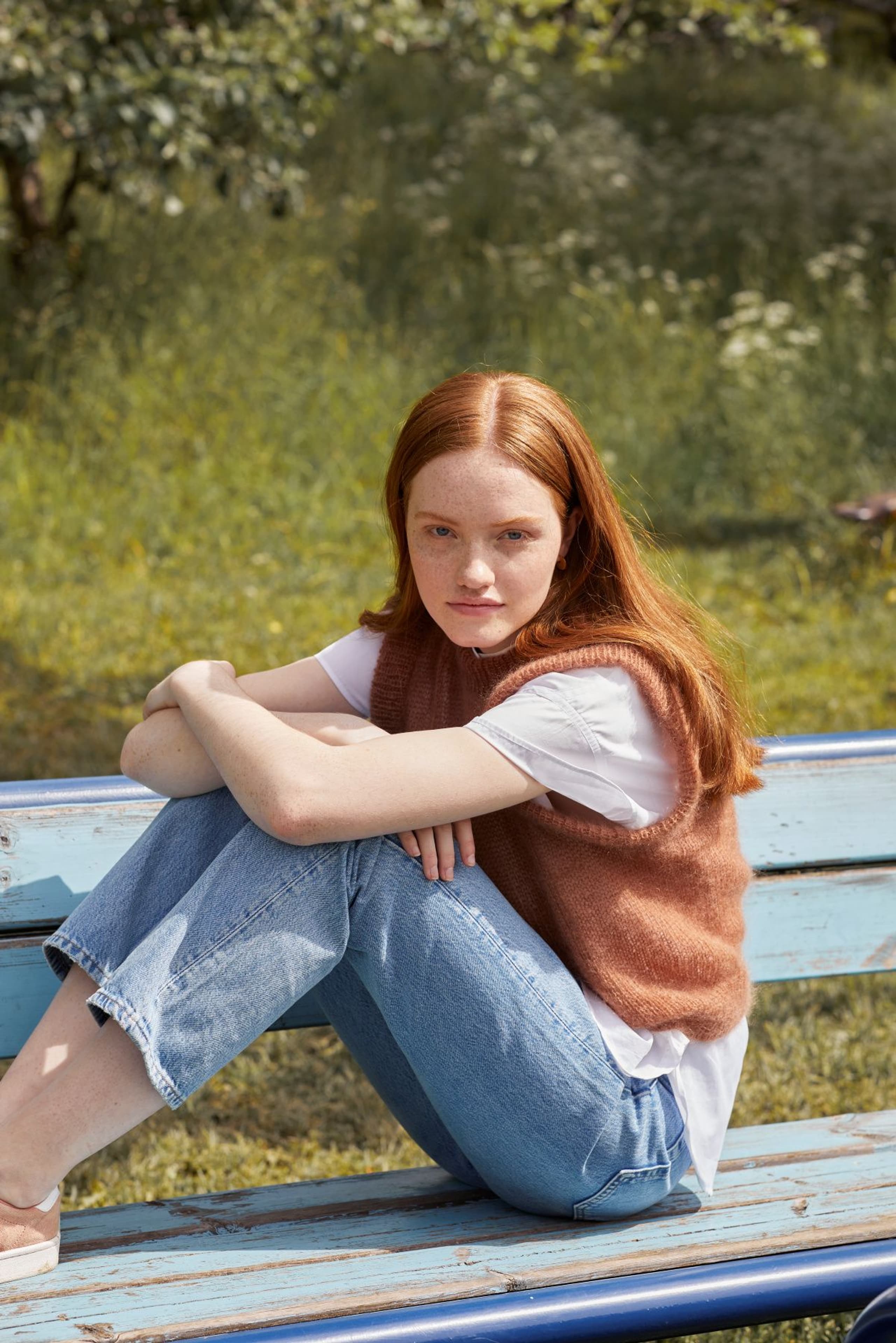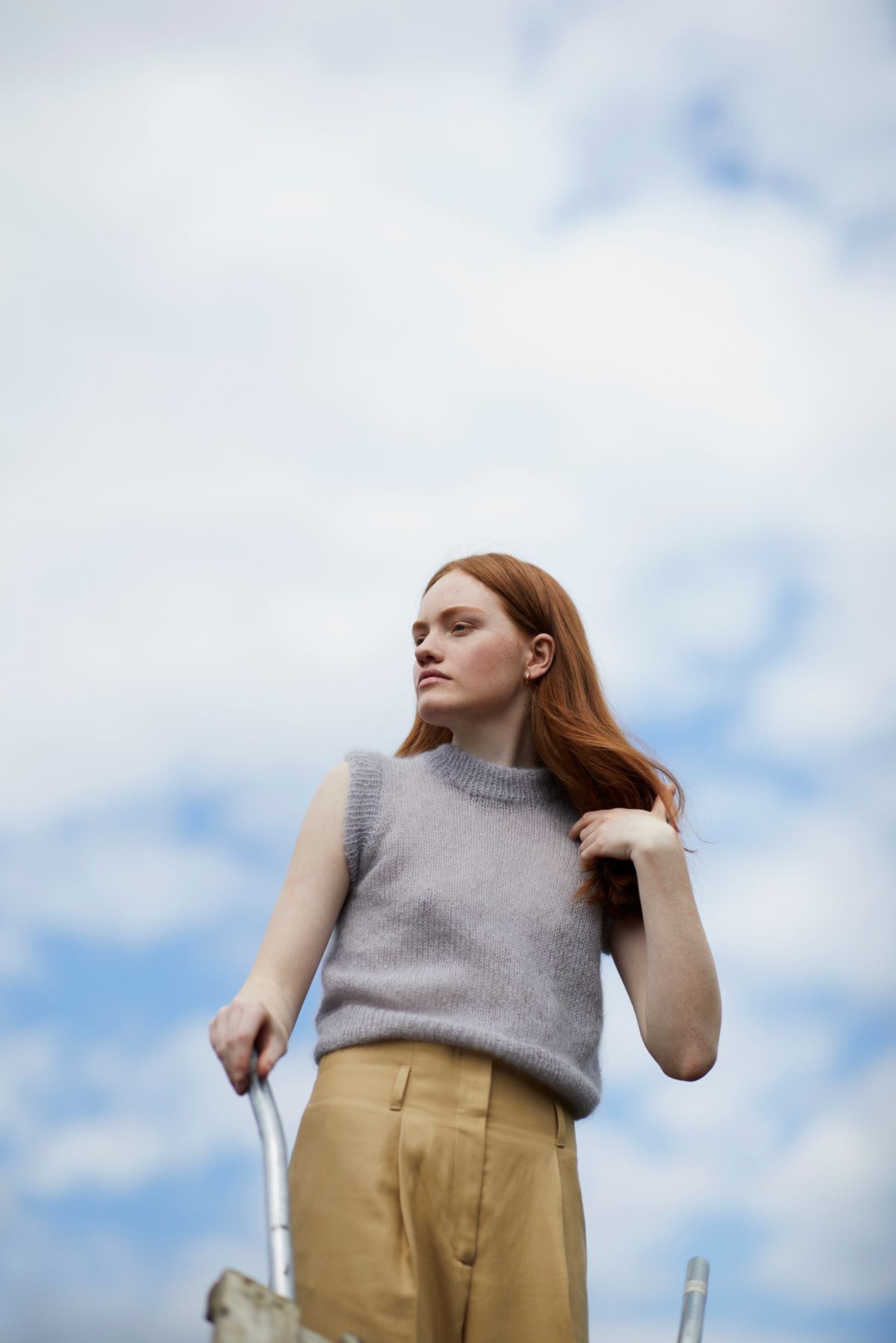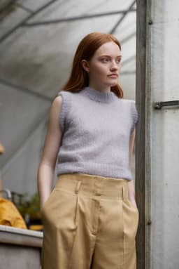 Sofiavest er en enkel glattstrikket vest strikket nedenfra og opp. Ermekanter strikkes til slutt. Vesten har en kort passform som passer over en bukse eller et skjørt med høyt liv, eller en kjole. Ønsker du en lengre passform er det enkelt å strikke bol litt lenger før det felles til ermehull. Pass i så fall på å beregne litt ekstra garn. Hele vesten strikkes med dobbel tråd.