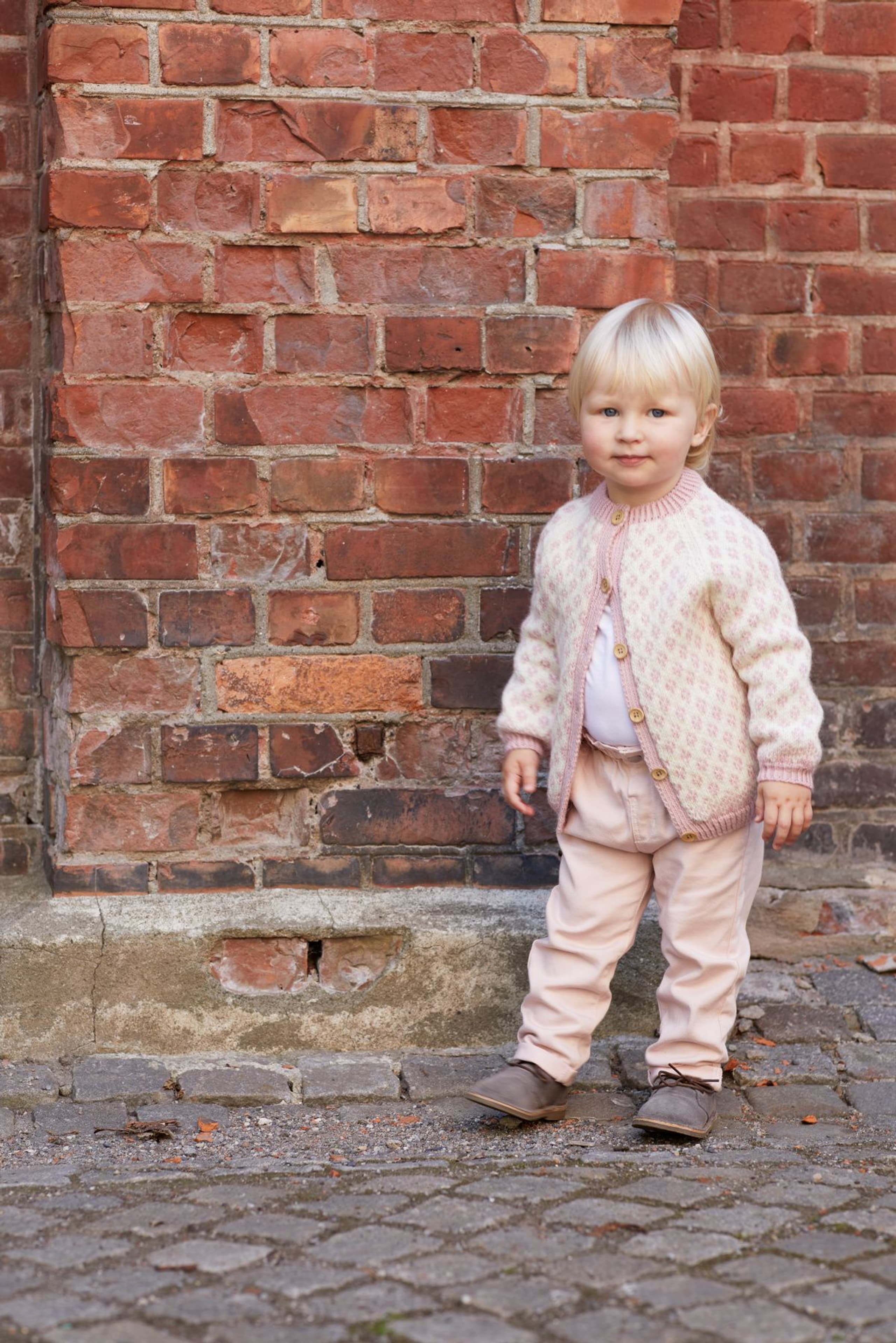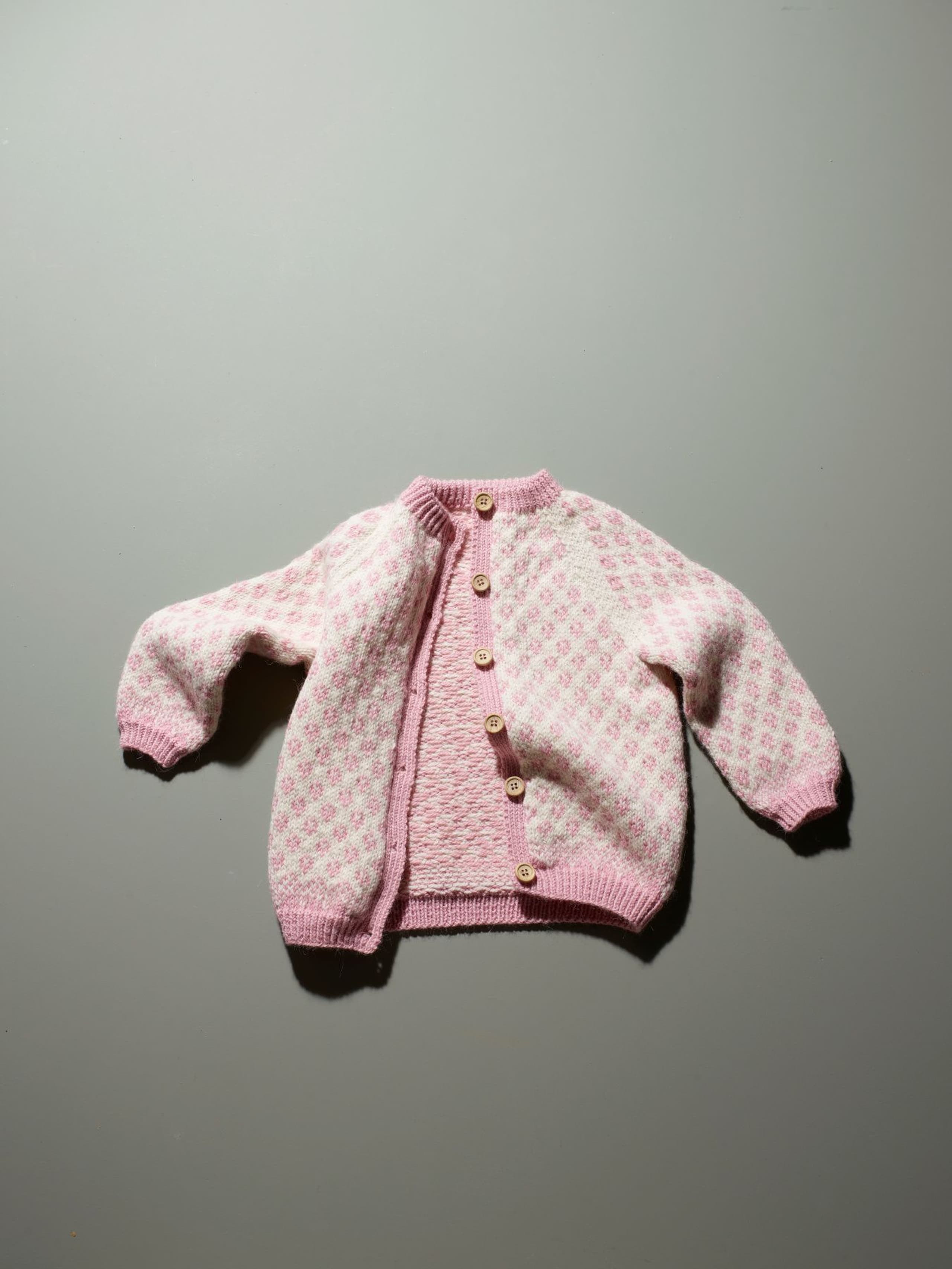 Solbærjakken er helmønstret raglanjakke. Jakken er strikket rundt og klipt opp foran.