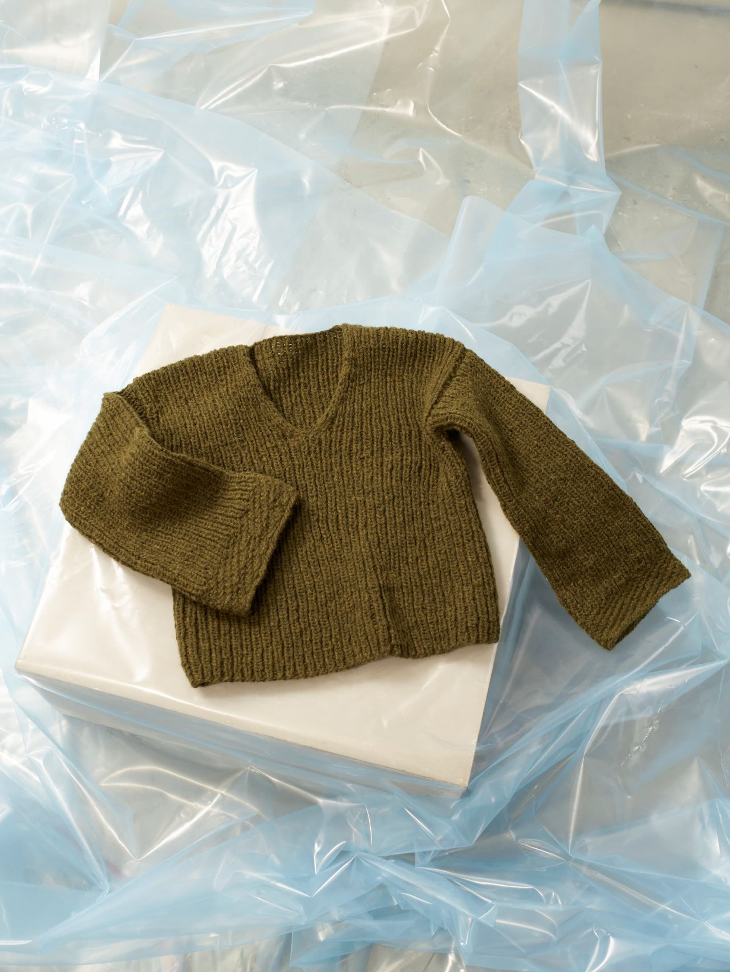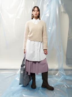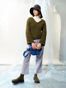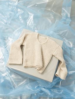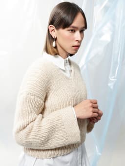 Puno Petit er utgående. Denne genseren er strikket nedenfra og opp i ribbestrikk og dobbelt garn. Genseren har V-hals og isydde trompet-ermer. Mansjettene er strikket med en dekorativ fiskebensmønstret strukturbord. Teknikken tar litt tid å strikke, men gir en forseggjort og fin finish til plagget.