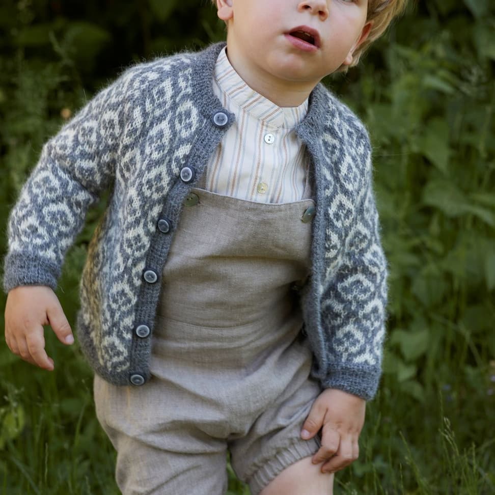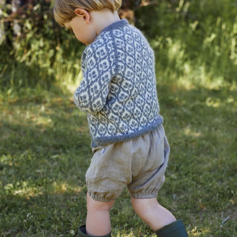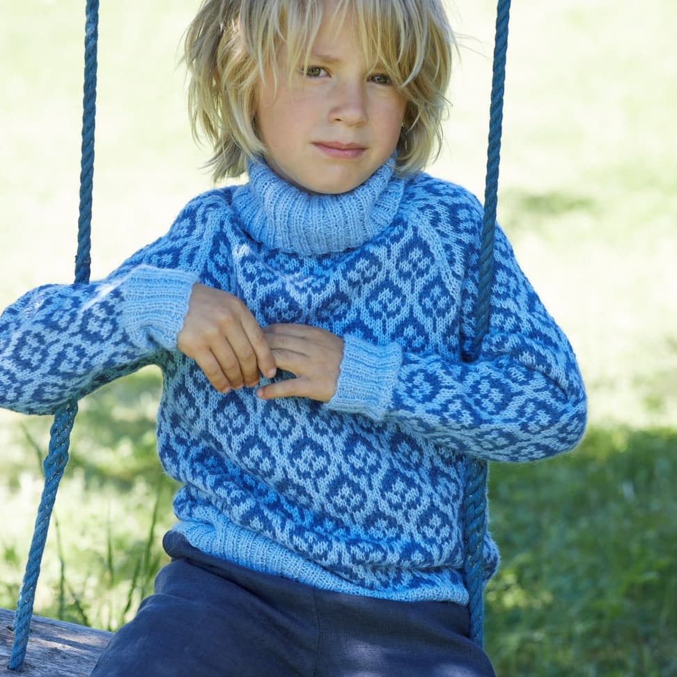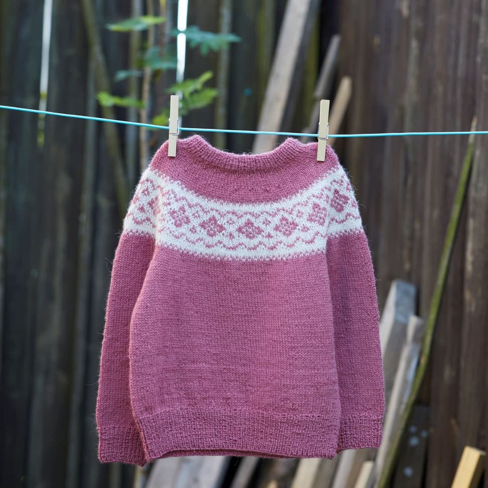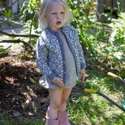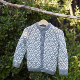 Helmønstret jakke med raglanfelling i to farger, strikket nedenfra og opp. Jakken er strikket rundt og klippet opp foran ved montering.
