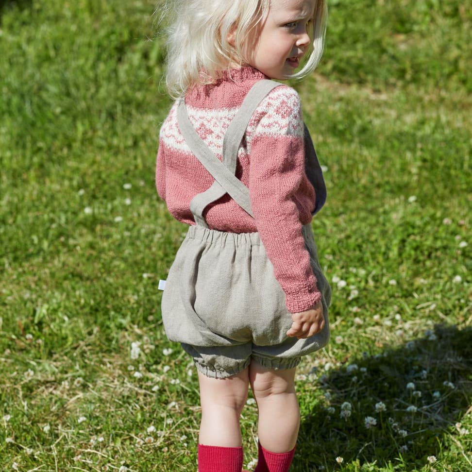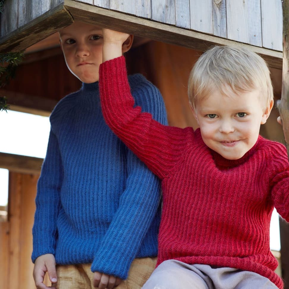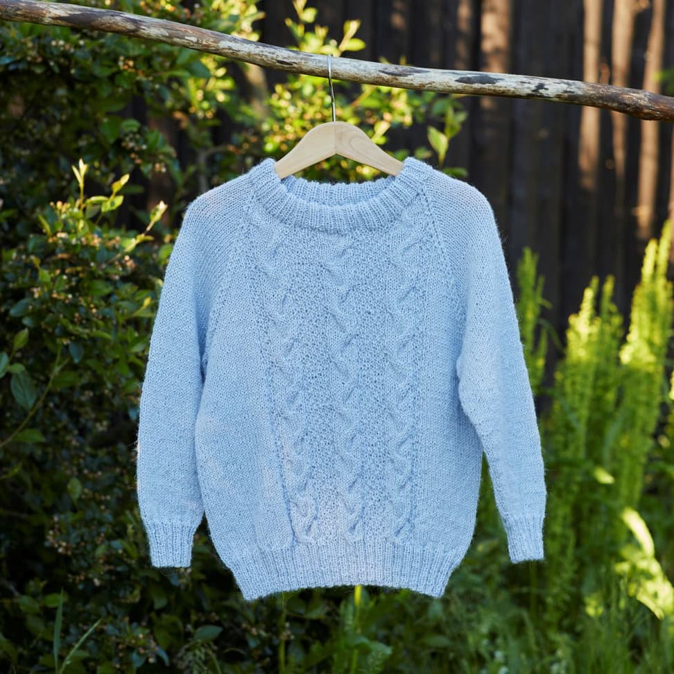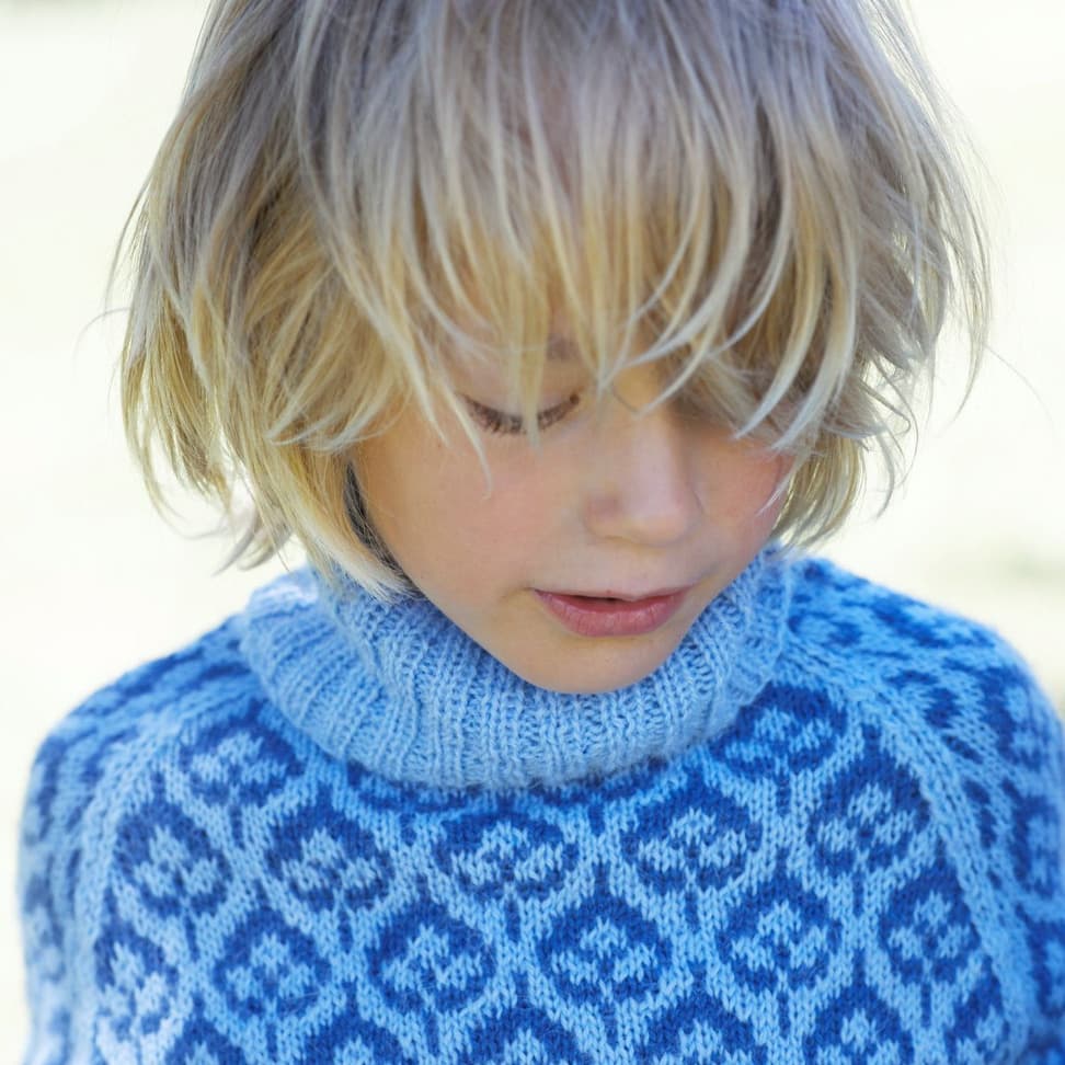 Helmønstret jakke med raglanfelling i to farger, strikket nedenfra og opp. Jakken er strikket rundt og klippet opp foran ved montering.