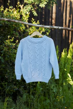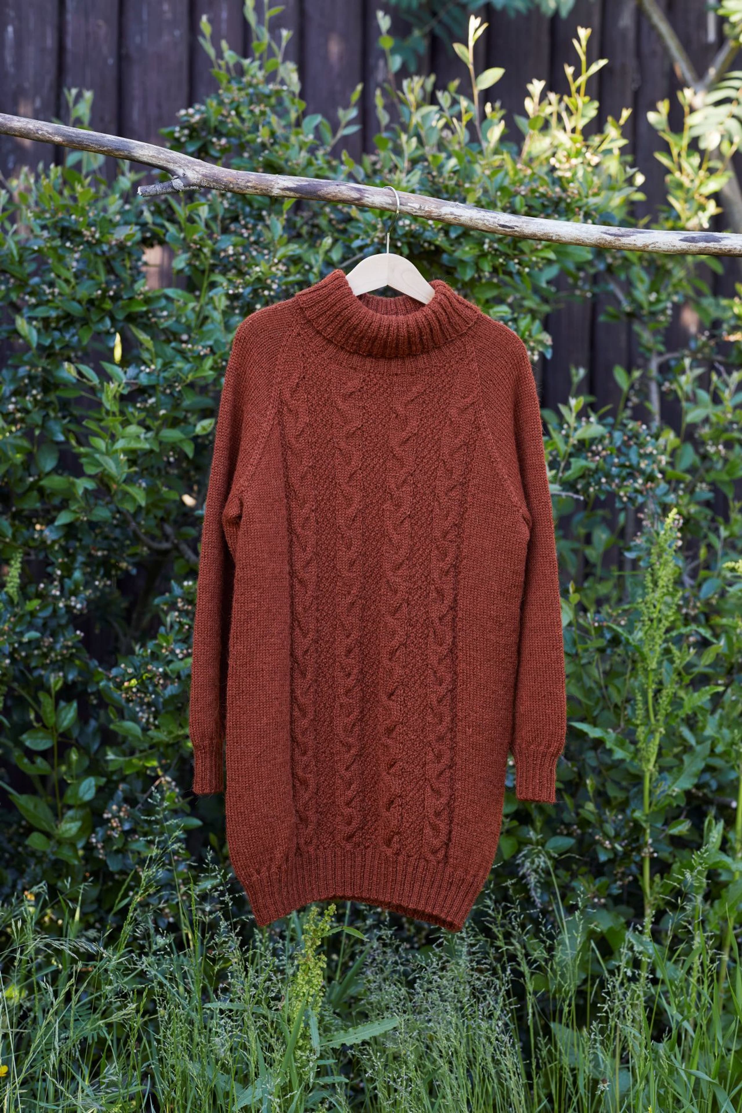 Genseren er strikket nedenfra og opp med raglanfelling og med flettemønster på for - og bakstykket.