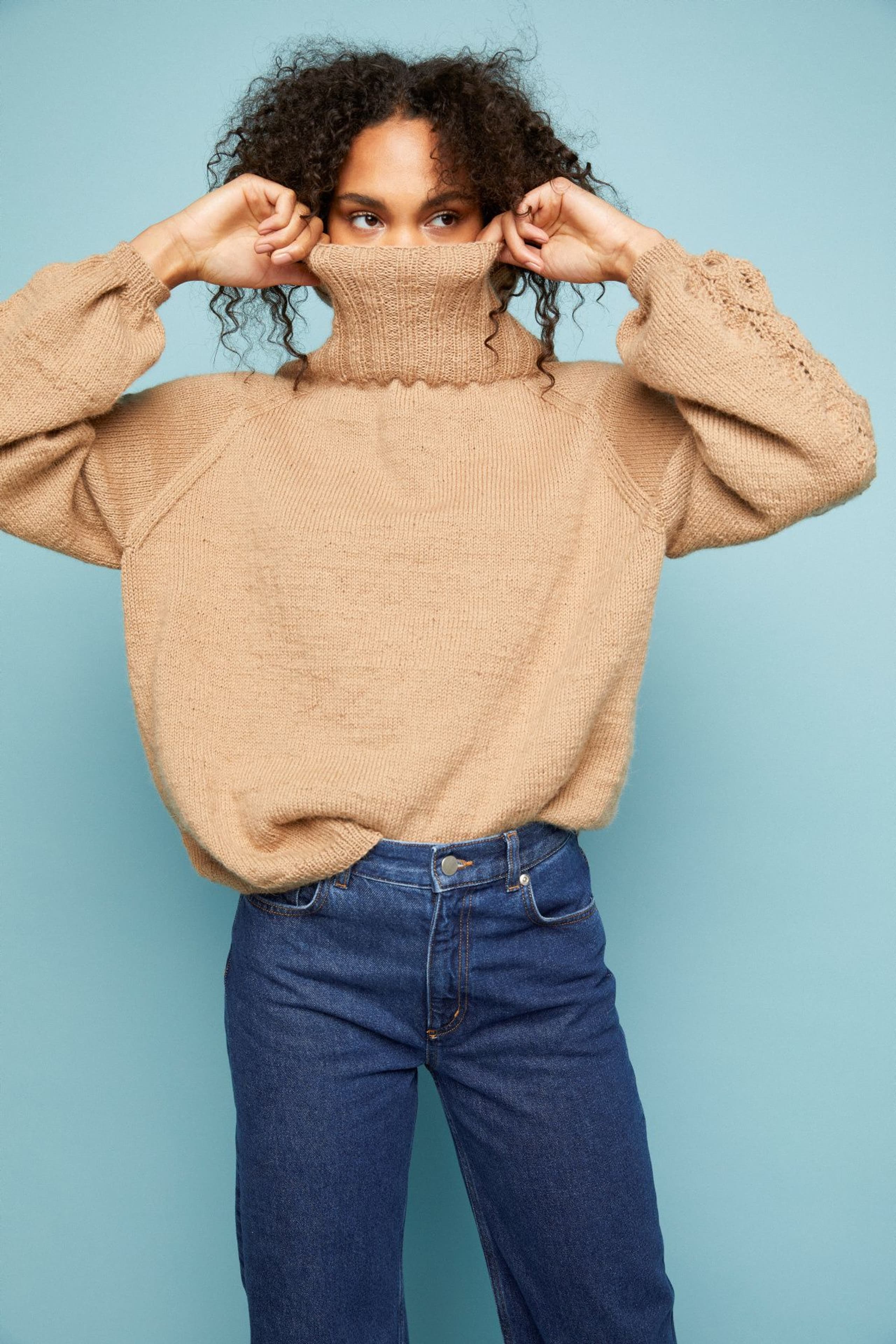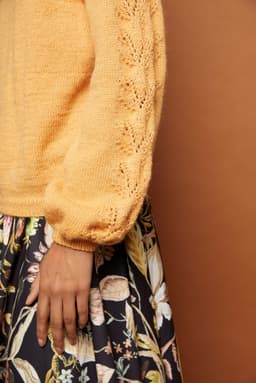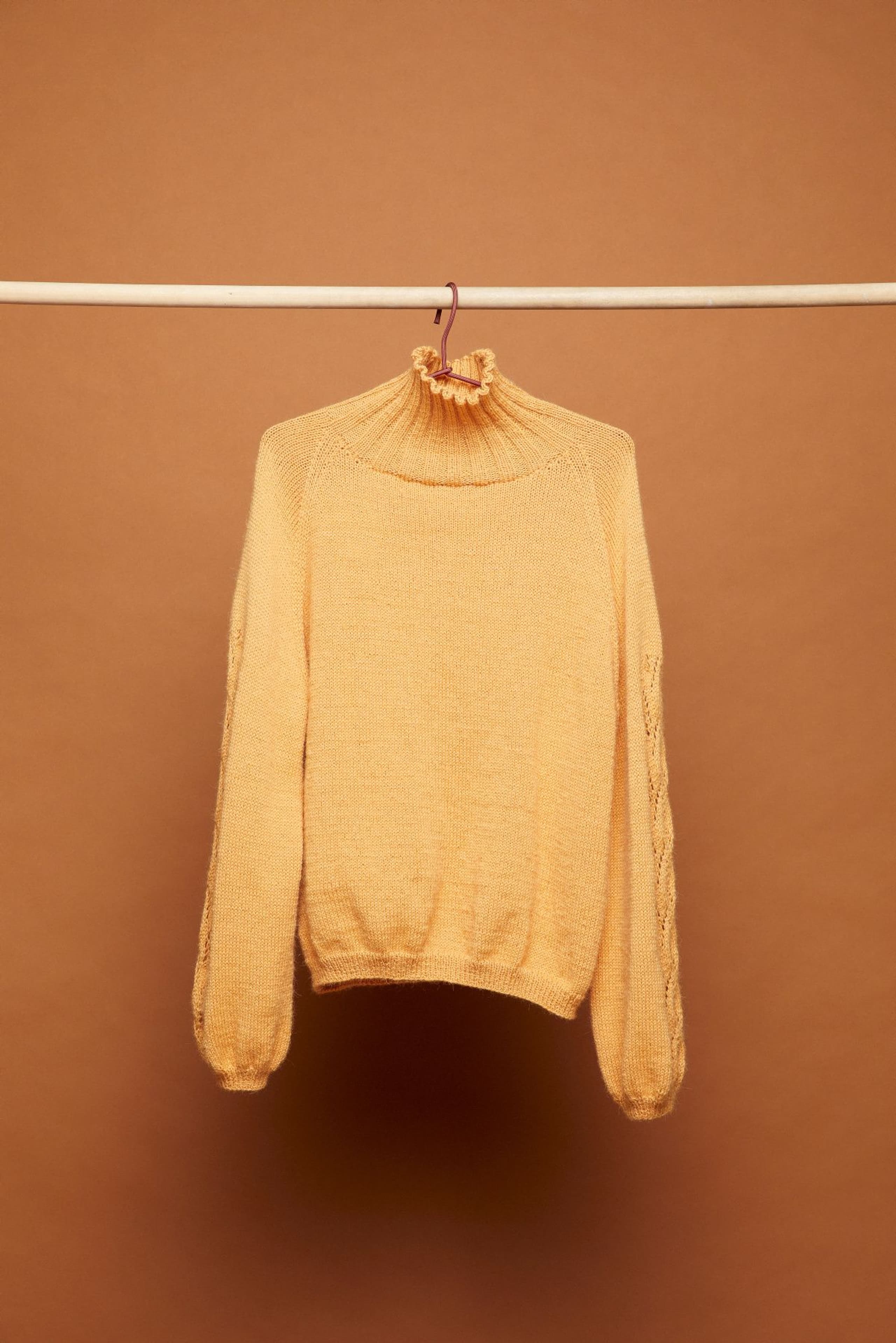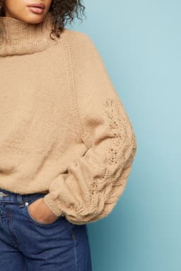 Aminagenseren har det lille ekstra med hullstrikk langs ermene. Ellers er det en klassisk genser; strikket nedenfra og opp med raglanfellinger og høy hals. Fasongen er romslig med ca 17 cm tenkt bevegelsesvidde.