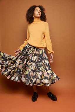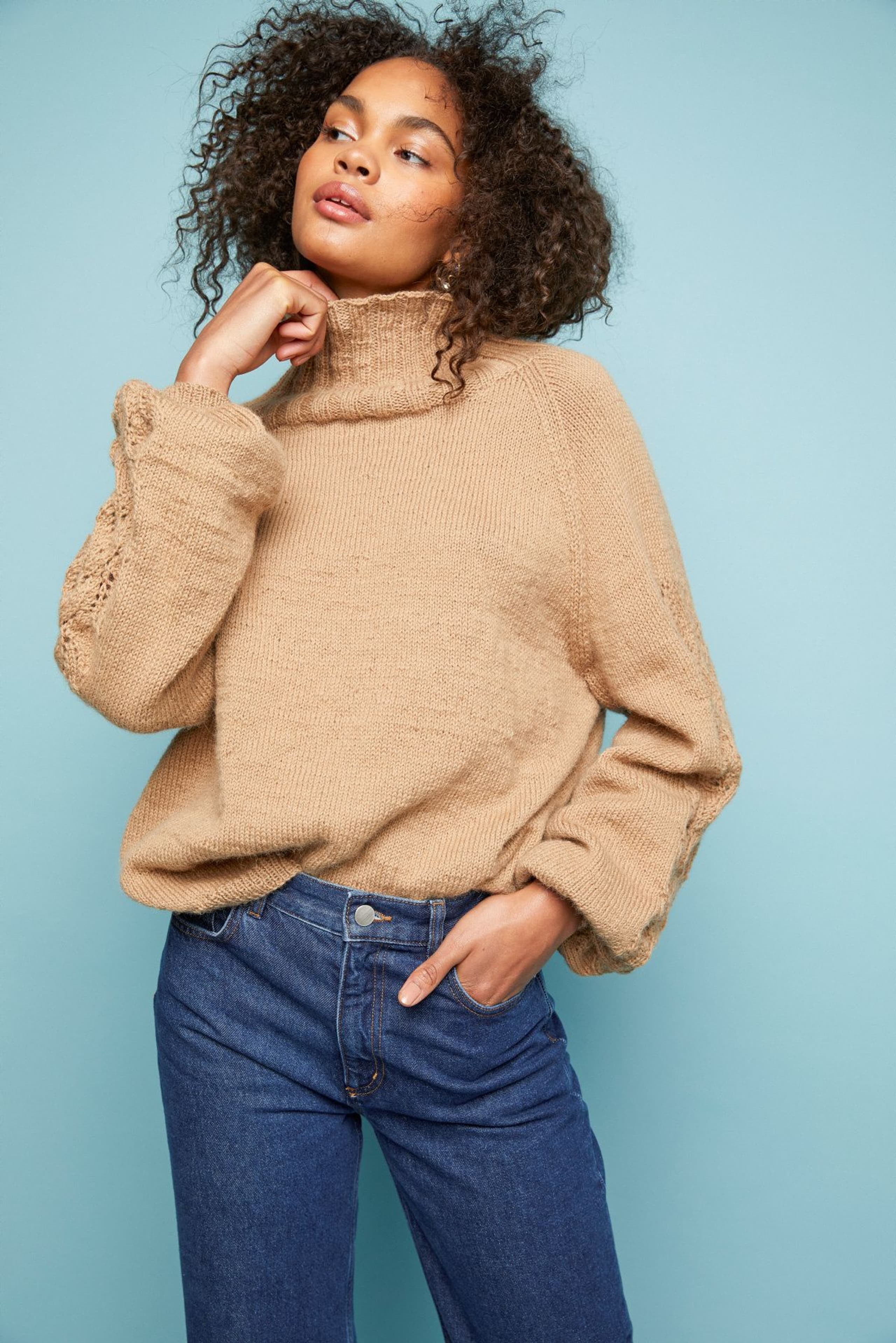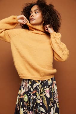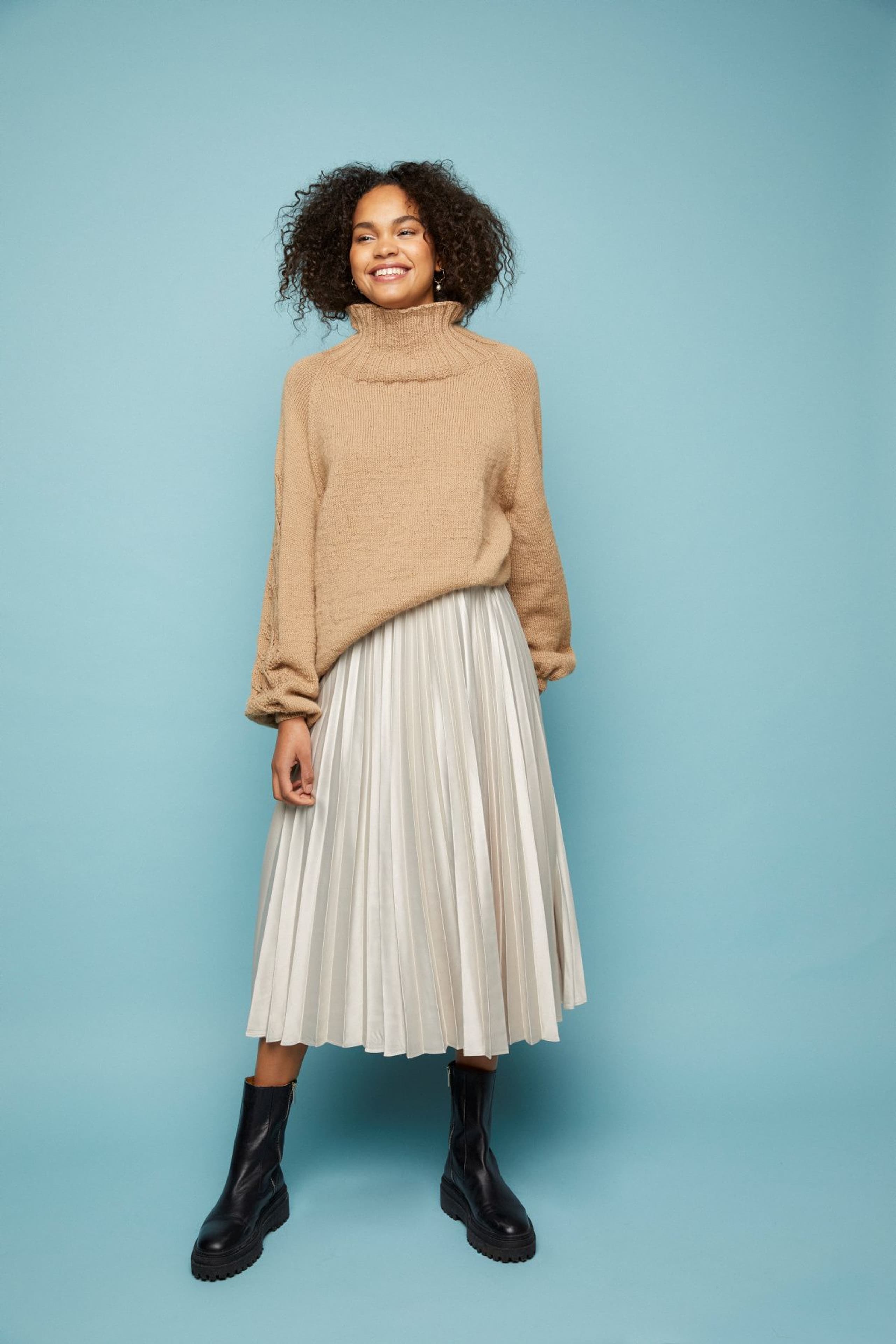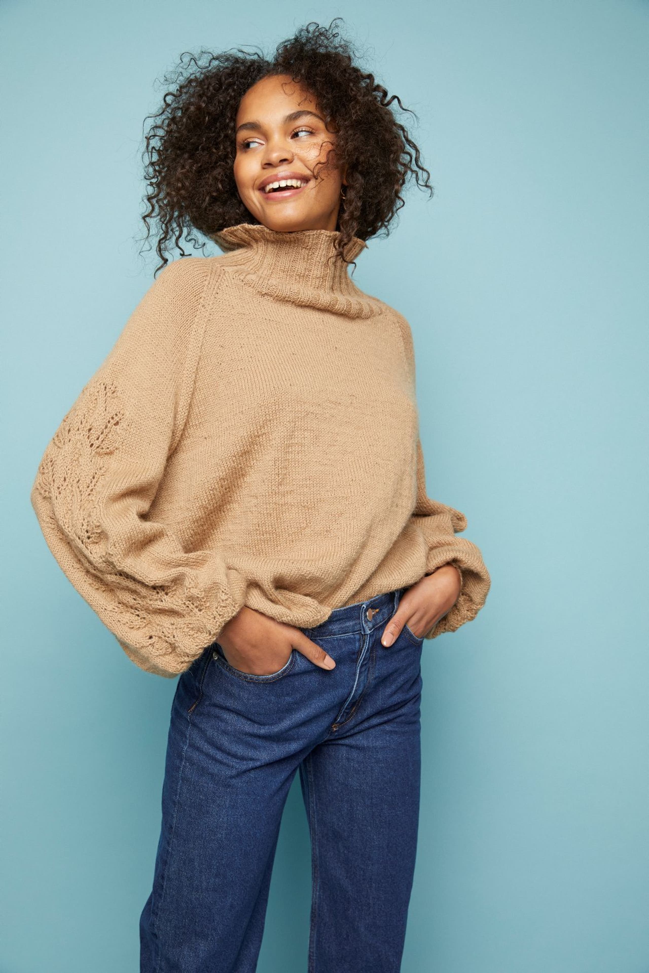 Aminagenseren har det lille ekstra med hullstrikk langs ermene. Ellers er det en klassisk genser; strikket nedenfra og opp med raglanfellinger og høy hals. Fasongen er romslig med ca 17 cm tenkt bevegelsesvidde.