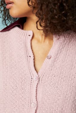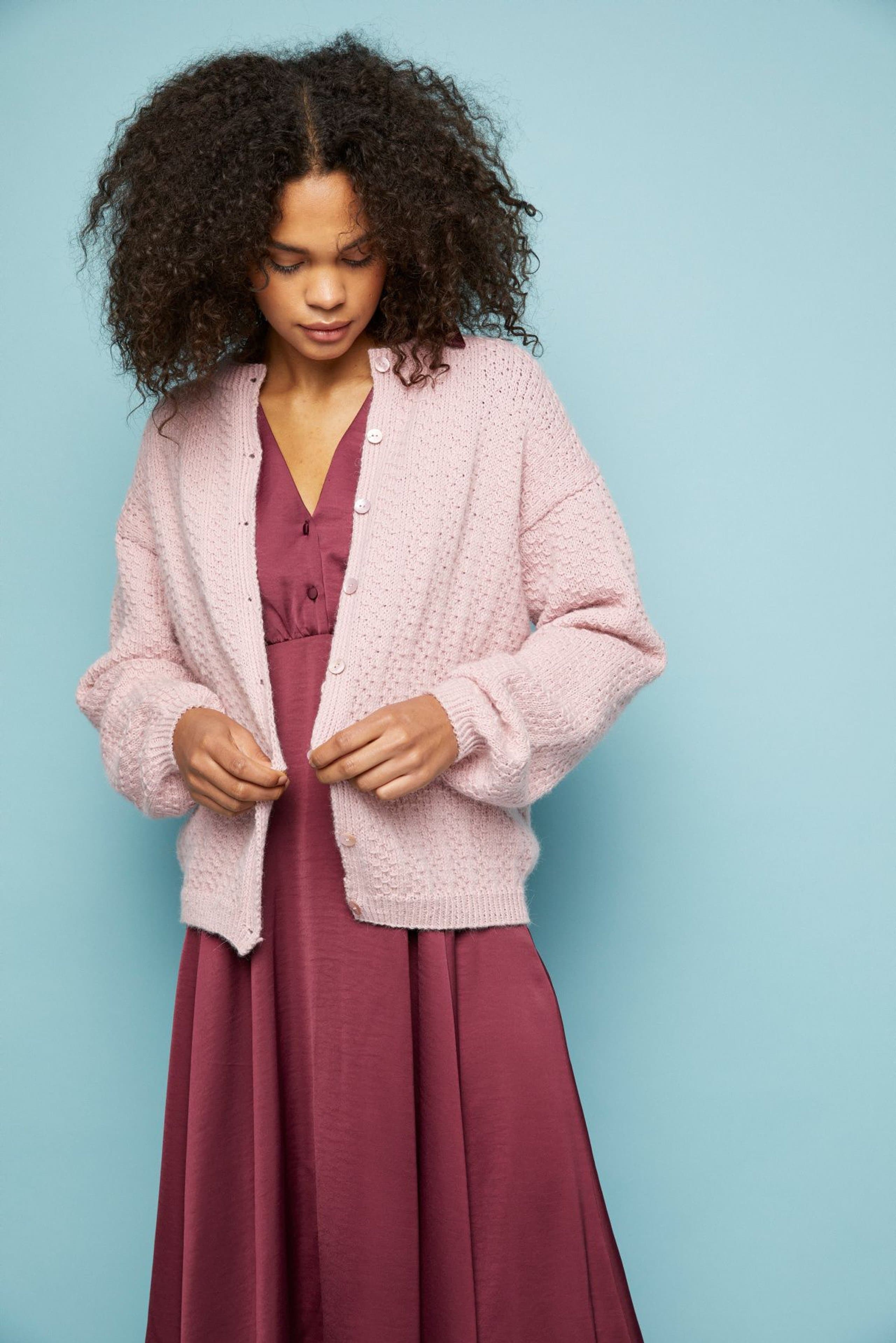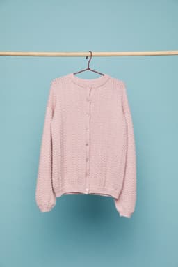 Noemiejakken har isydde ermer og en nett struktur. Jakken er strikket fram og tilbake. Bevegelsesvidde på ca 5 cm.