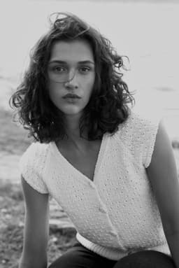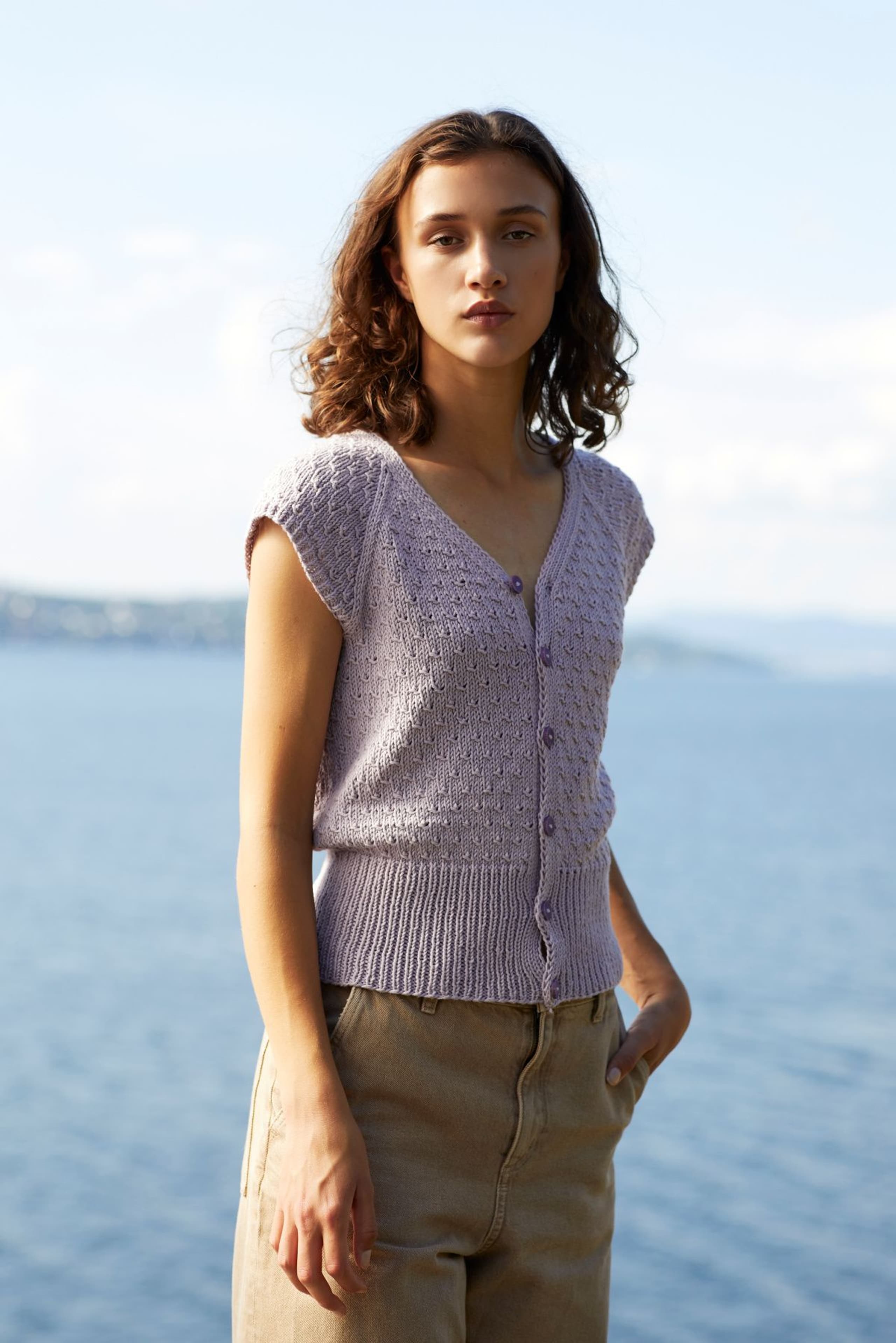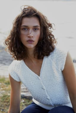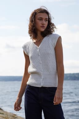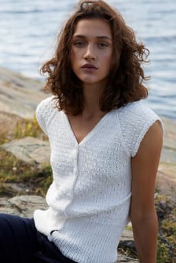 Topp med v-hals, korte ermer med raglanfelling og med åpning foran med knapper. Den strikkes nedenfra og opp. Toppen har en høy vrangbord nederst og resten av toppen er strikket i strukturmønster. Toppen har en tenkt bevegelsesvidde på 8 cm.