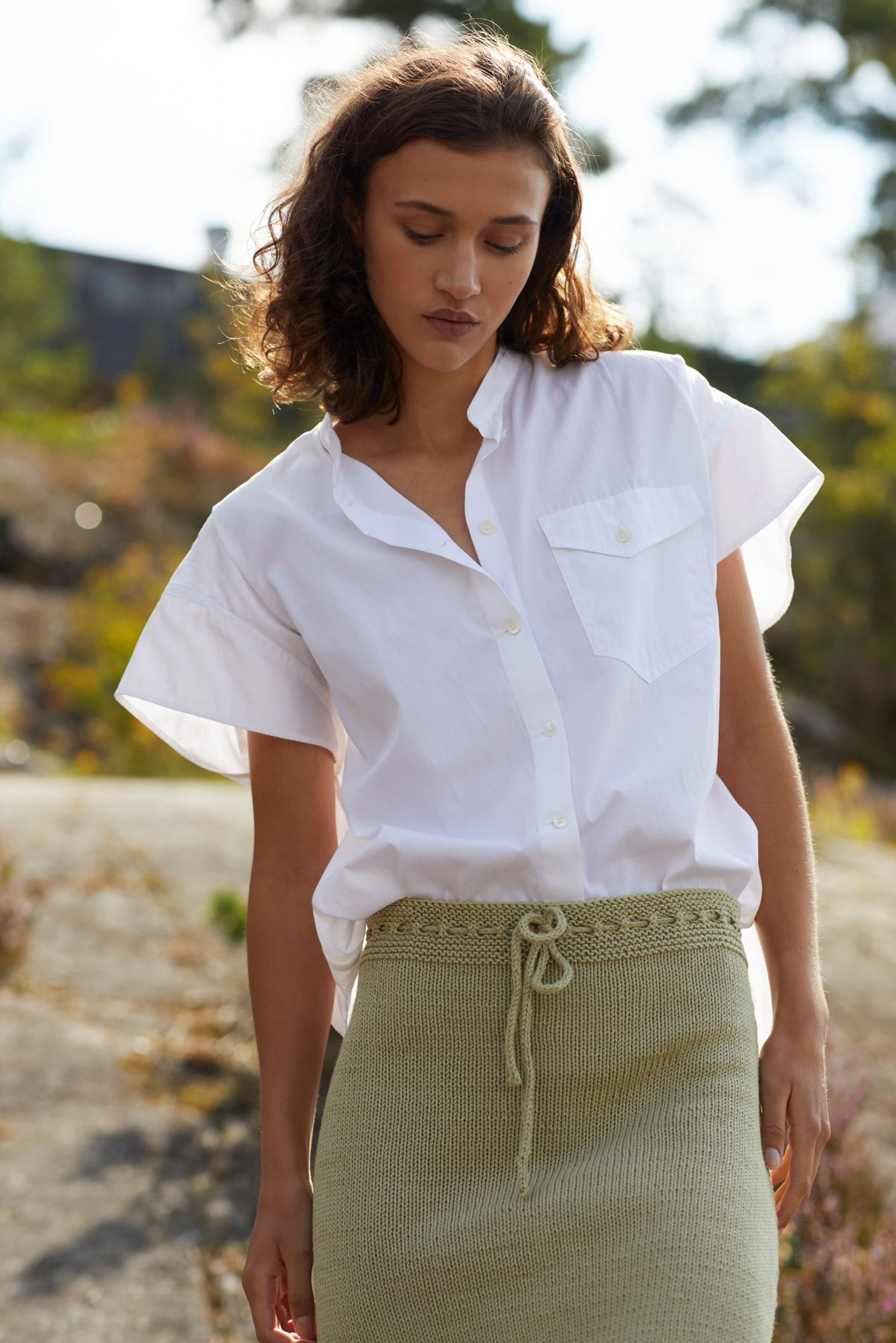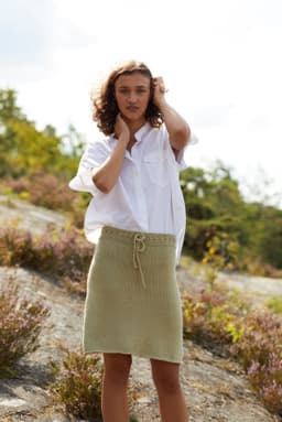 Skjørtet strikkes rundt nedenfra og opp. I livet er det laget en hullbord, som det tres en strikket snor igjennom.