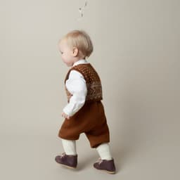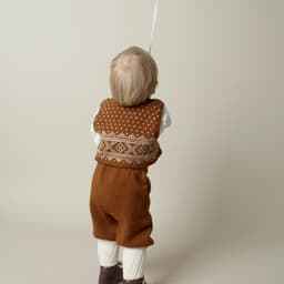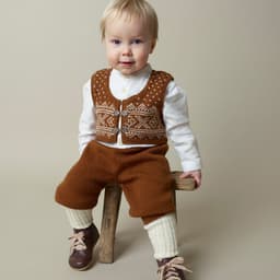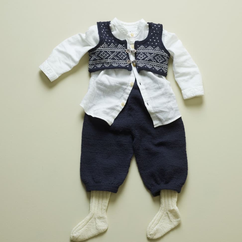 Vesten strikkes rundt nedenfra og opp, med åpning foran. Åpningen foran syes og klippes opp før forkantene strikkes på. Vesten lukkes med hekter. **Tilbehør**: 2 sett tinnhekter, Gry nr 40.