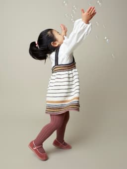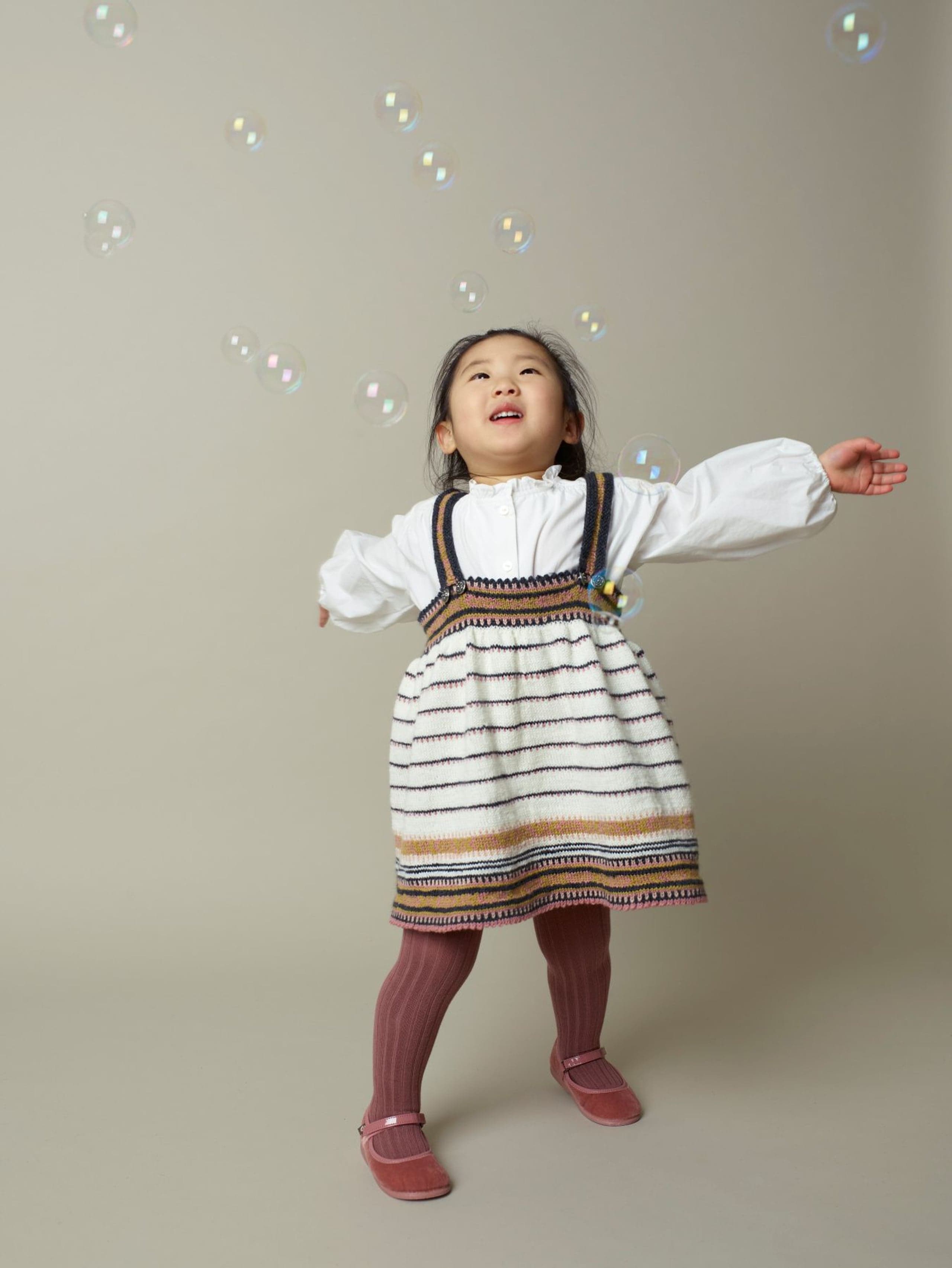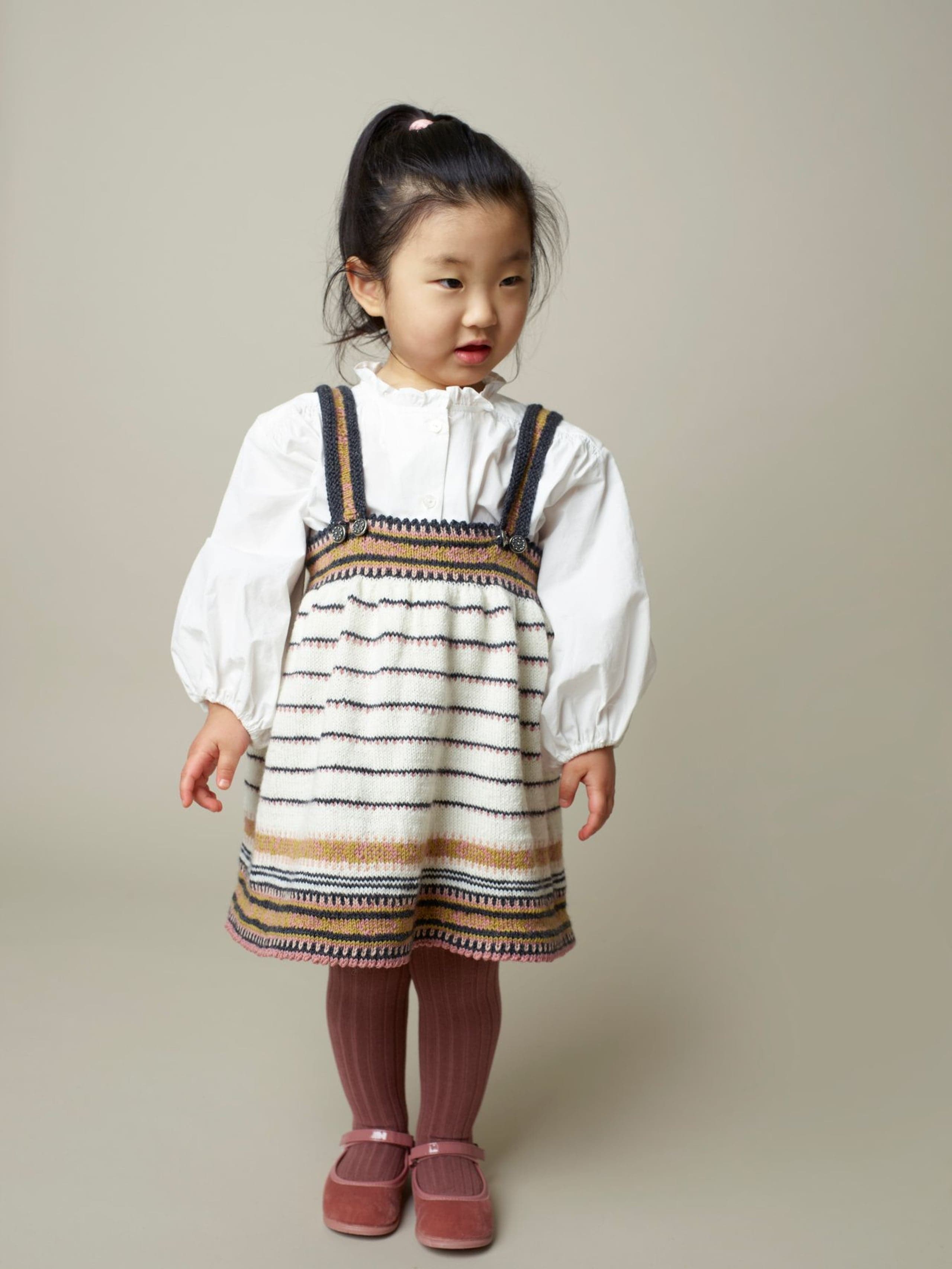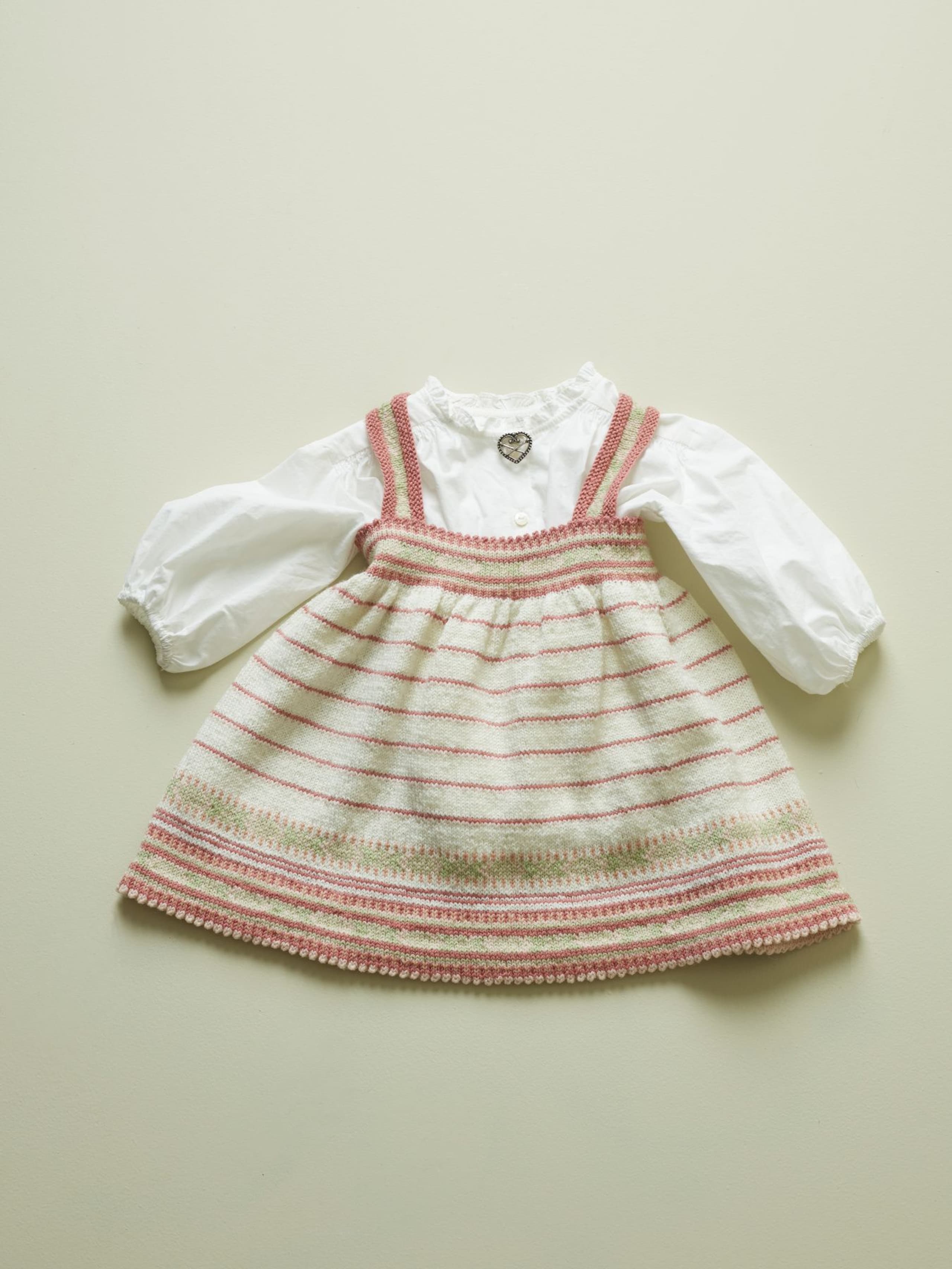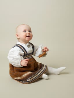 Skjørtet er inspirert av mønsteret til Vestfoldbunaden. Det er strikket nedenfra og opp og har en åpning i linningenbak som lukkes med knapper. Selene strikkes hver for seg og sys fast, eller festes med hemper og knapper foran. **Tilbehør**: 4-6 tinnknapper, Frøy liten nr 82