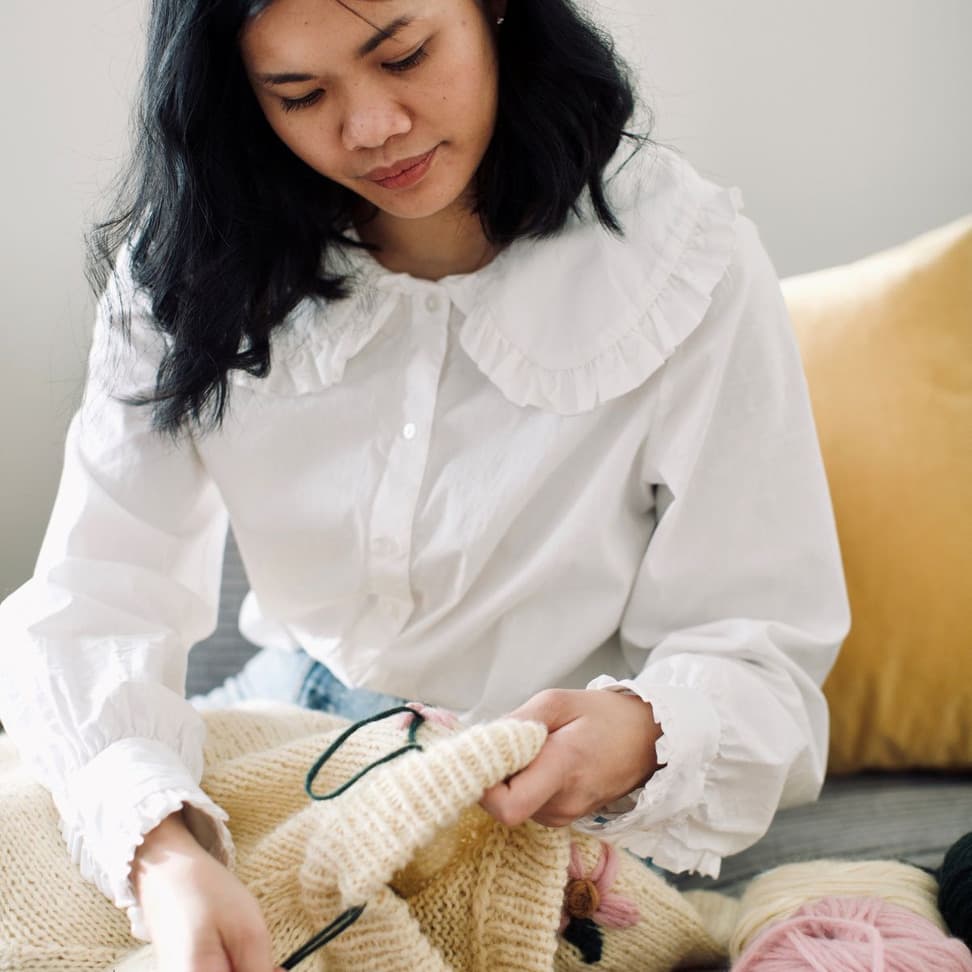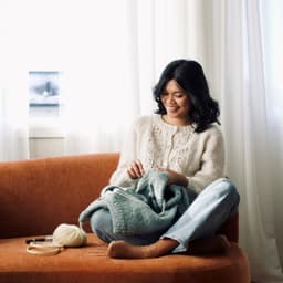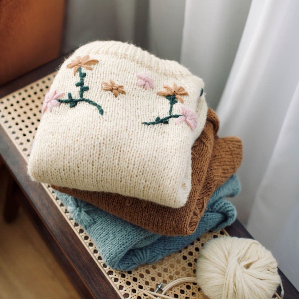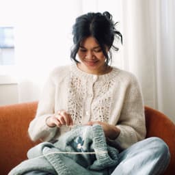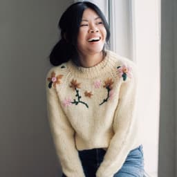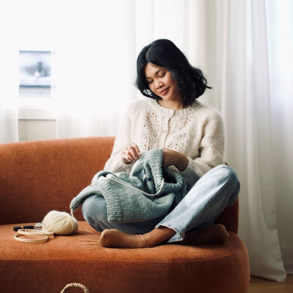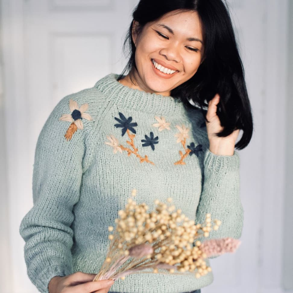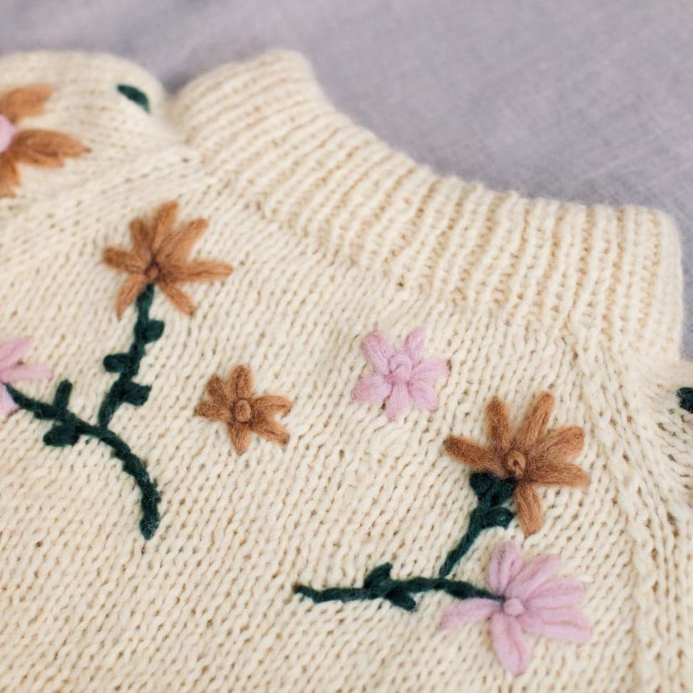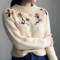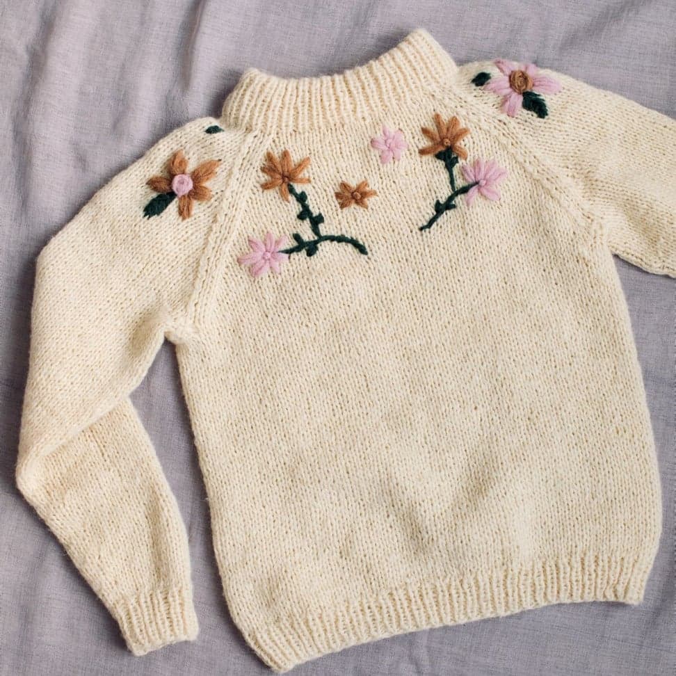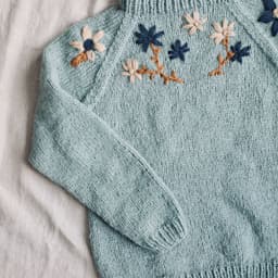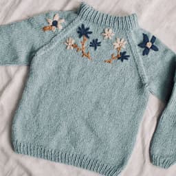 Enkel raglangenser i glattstrikk og ribbestrikkede kanter. Genseren strikkes nedenfra og opp.
