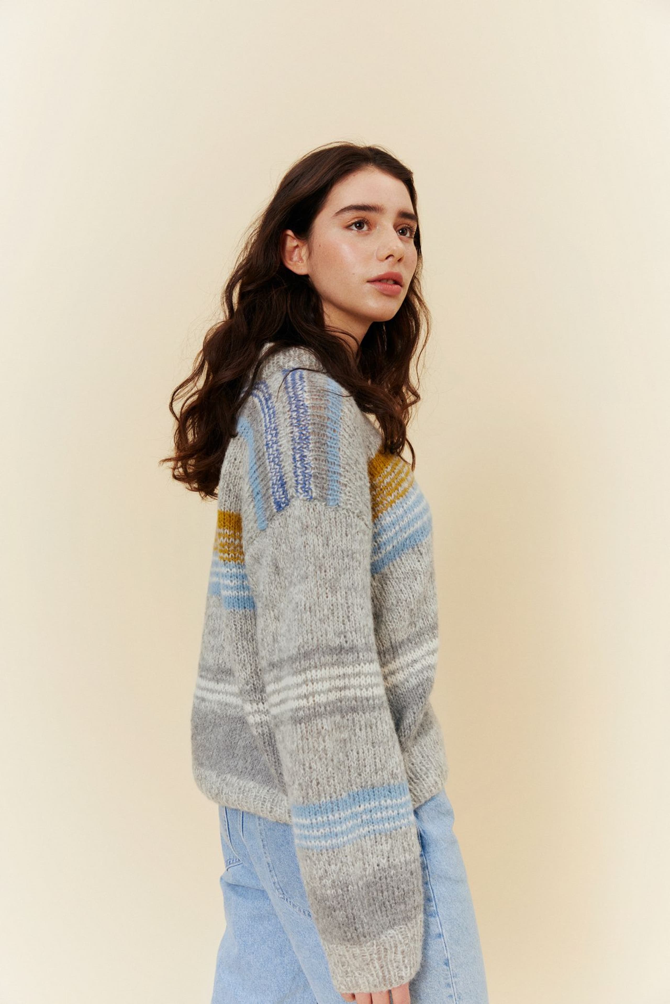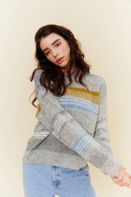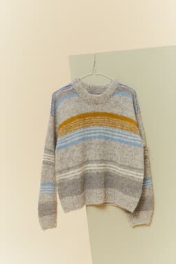 Enkel glattstrikket genser med striper. Hele genseren er strikket med to tråder. Strikket nedenfra og opp, med isydde ermer. Genseren har en tenkt bevegelsesvidde på 8 cm.