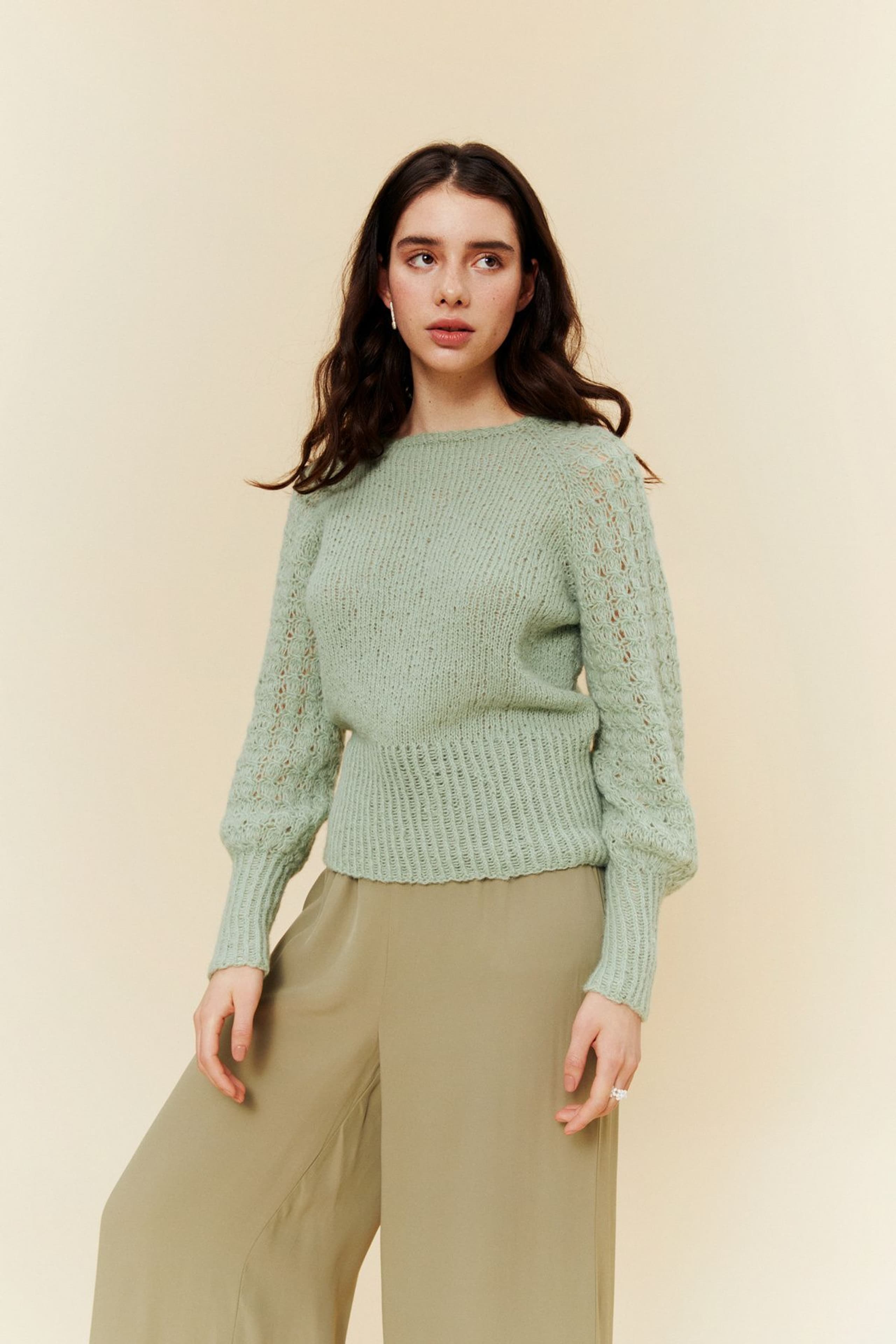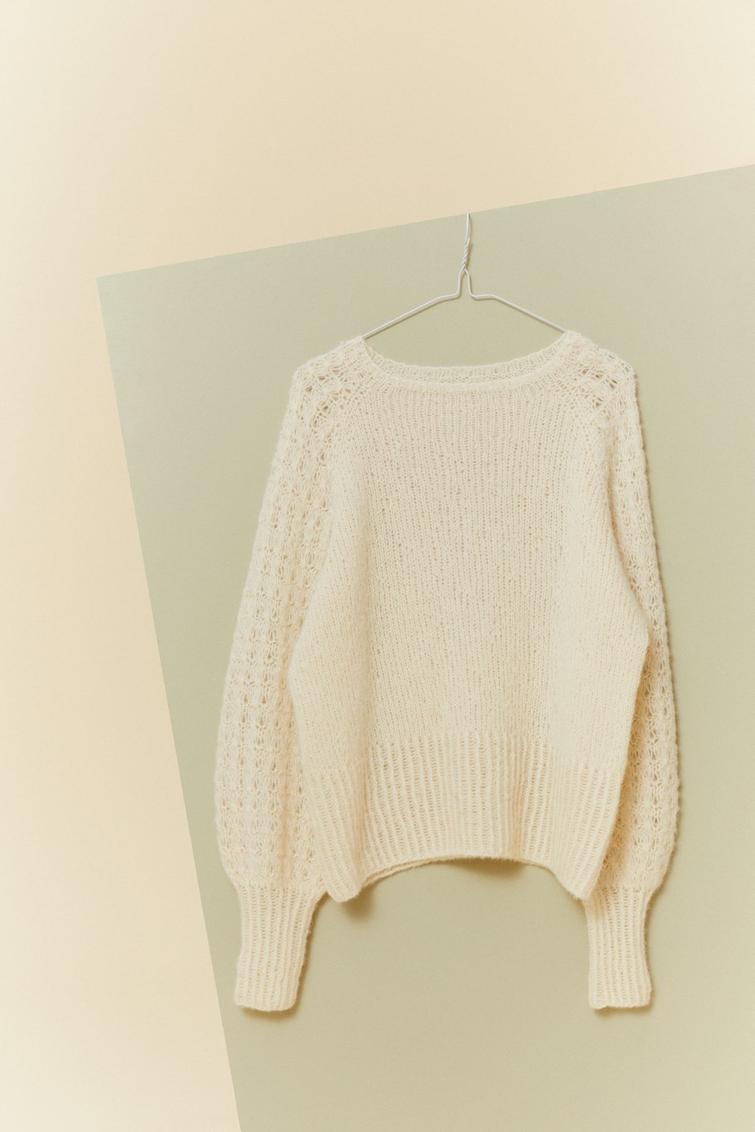 Hele genseren strikkes med to tråder. Den strikkes rundt ovenfra og ned, med mønster på hvert erme og glattstrikk på for- og bakstykket. Genseren har en tenkt bevegelsesvidde på 8 cm. –