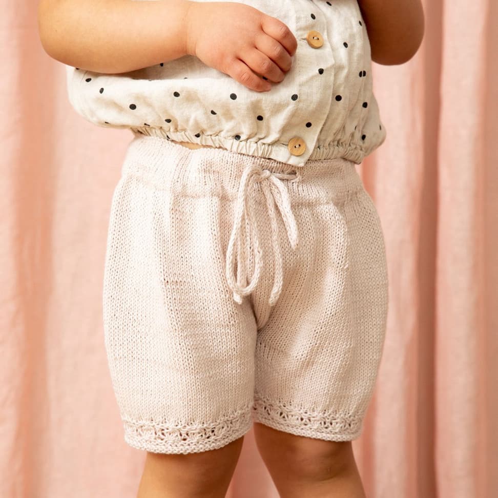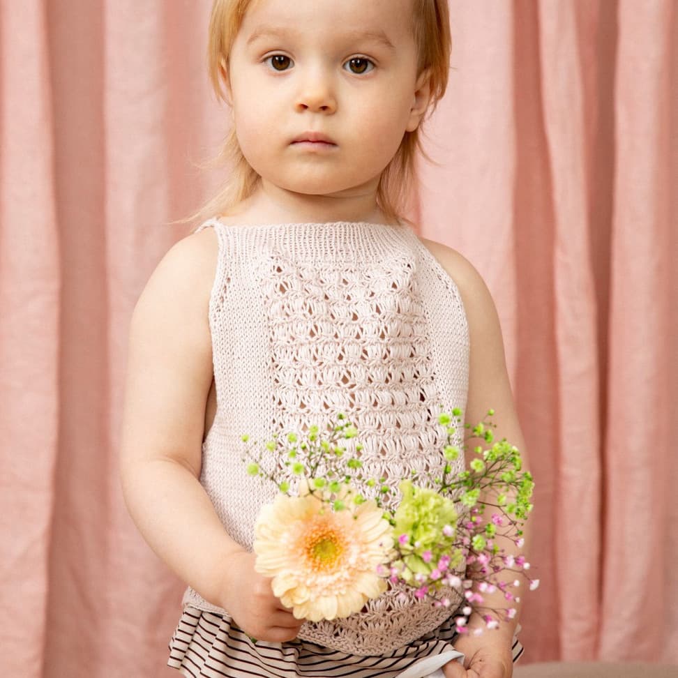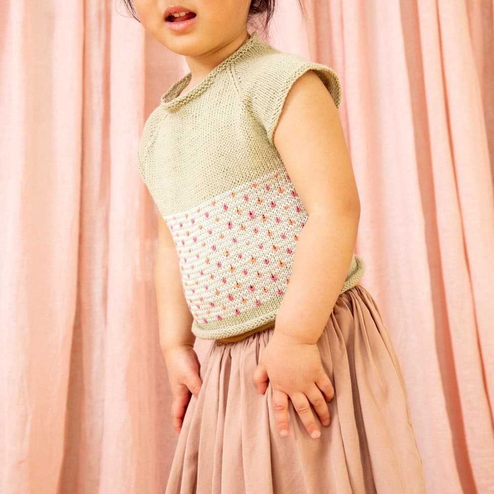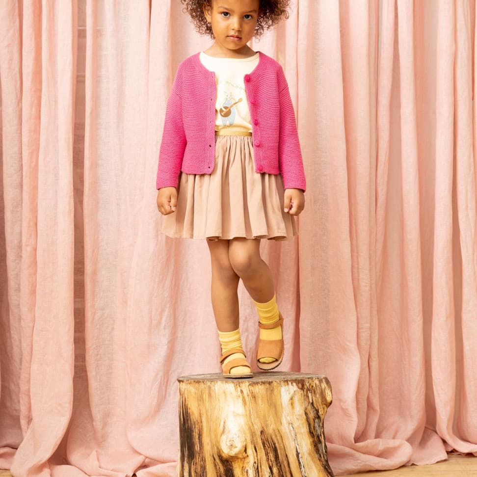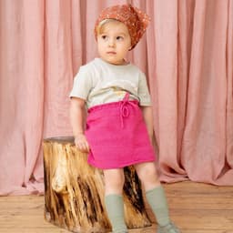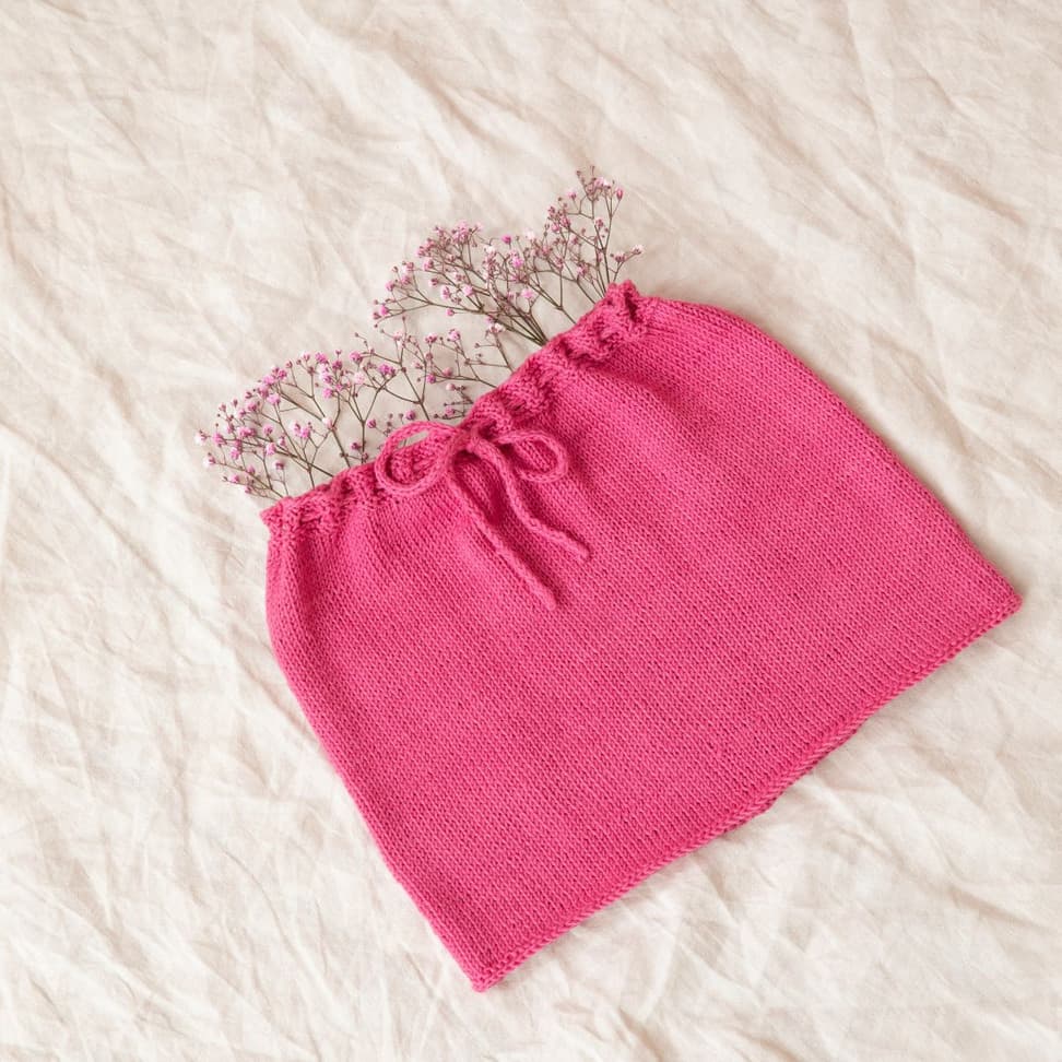 Skjørtet strikkes ovenfra og ned med riller i livet og glattstrikk videre. Skjørtet kan enkelt strikkes lengre eller kortere. Det har en strikket snor til knytting i livet.