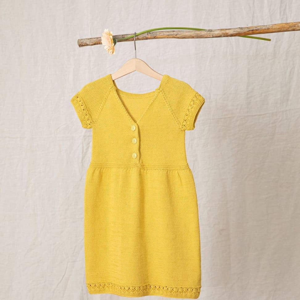Isabellakjolen strikkes rundt i glattstrikk nedenfra og opp til livet, deretter strikkes det frem og tilbake fra midt foran. Åpning foran med knapper opp til v-felling i halsen. Kjolen har korte ermer med raglanfelling. Kjolen har en strukturbord nederst på skjørtet og på hvert erme og avsluttes med rillestrikk.