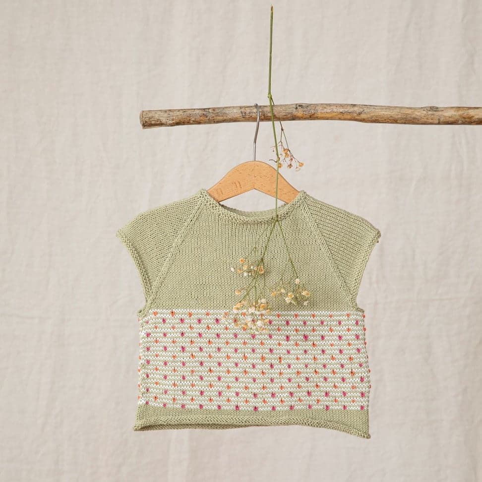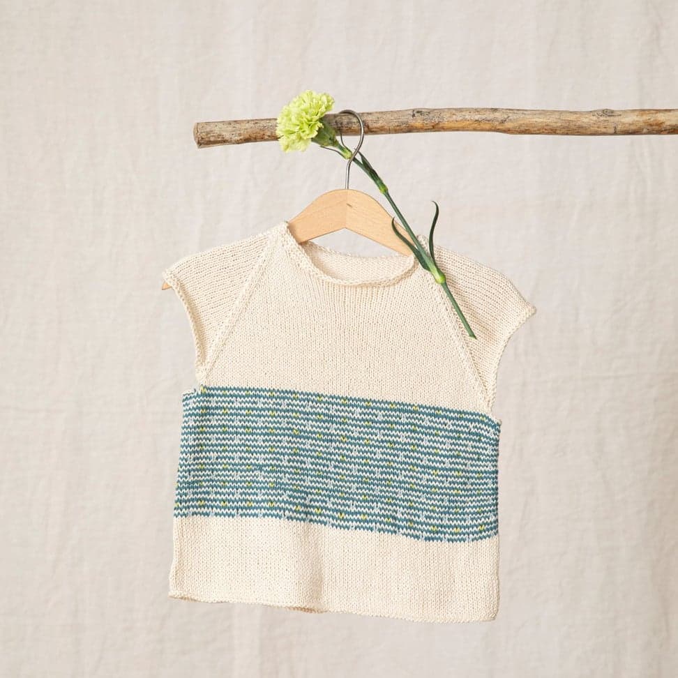 Toppen strikkes nedenfra og opp, og har mønster nederst på bolen. Den har korte ermer med raglanfelling og en liten avrunding i halsen. Toppen har en tenkt bevegelsesvidde på 5 cm.