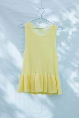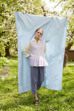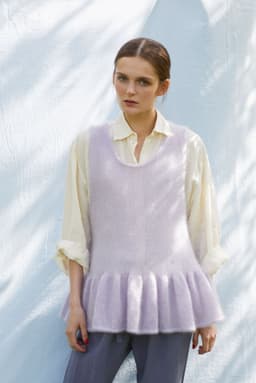 Lilje volangvest strikkes ovenfra og ned med tredobbel tråd. Skrå skuldre formes ved å strikke forkortede p/vendepinner på bakstykket. Volangen strikkes ved å øke 2 m i alle m på omgangen. Alle kanter avsluttes med i-cord-avfelling. Bruk vesten over en t-skjorte, bluse eller kjole!