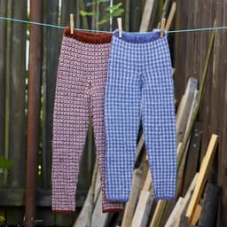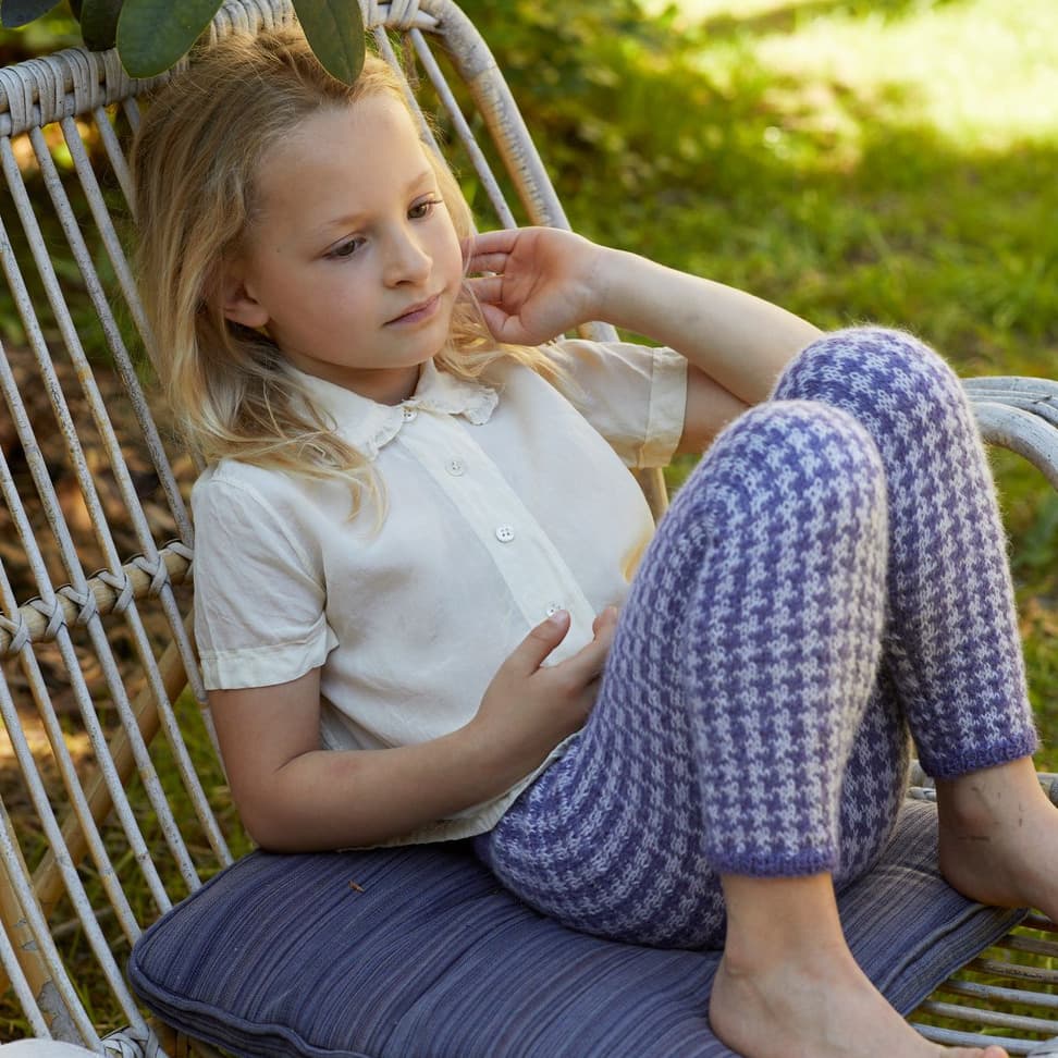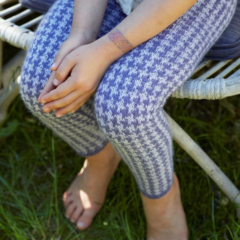 Tights med mønster. Den strikkes ovenfra og ned, benlengden kan derfor strikkes lengre eller kortere. Tightsen kan strikkes i to ulike mønsteralternativ, etter diagram 1, eller 2.