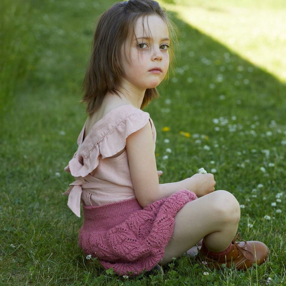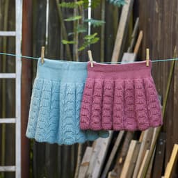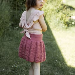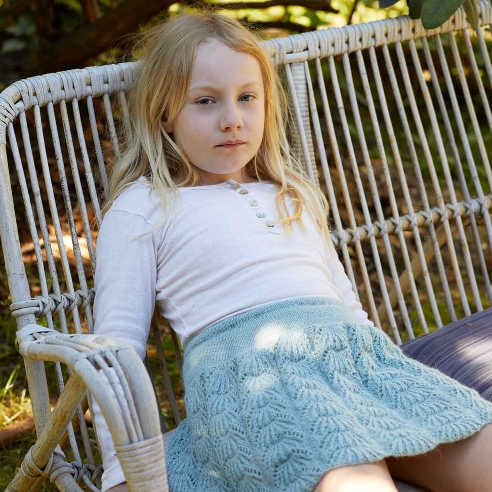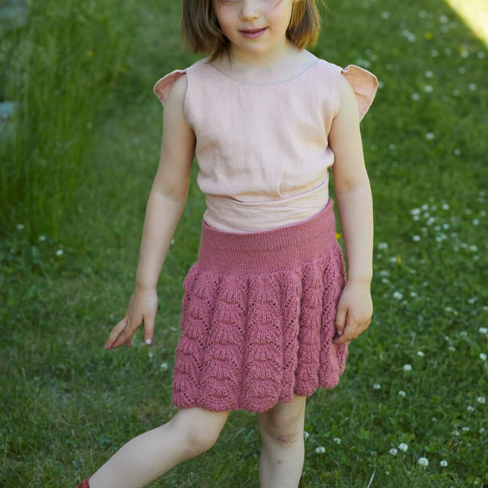 Skjørtet er strikket nedenfra og opp, med hullmønster opp til livet og glattstrikk videre.