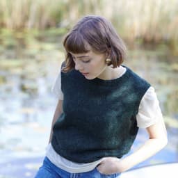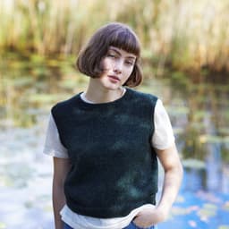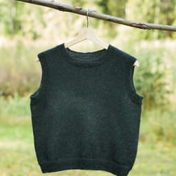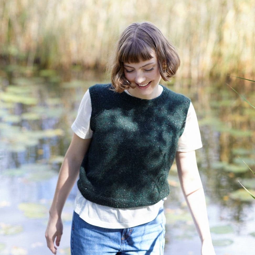 Alvavesten strikkes nedenfra og opp i glattstrikk. Den strikkes med Metallic som følgetråd slik at vesten får en delikat glimmereffekt. Vesten har liten bevegelsesvidde.