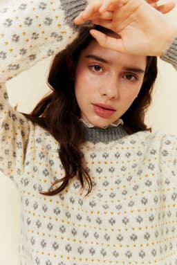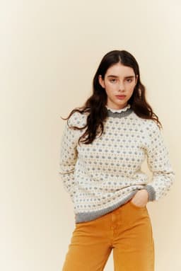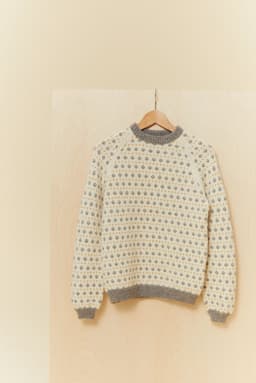 Blåbærgenseren er en småmønstret raglangenser i 3 farger. Den strikkes nedenfra og opp, med raglanfelling og ringning i halsen. Halskanten er strikket med vridde masker og er brettet dobbel mot vrangen.