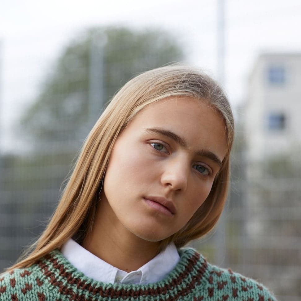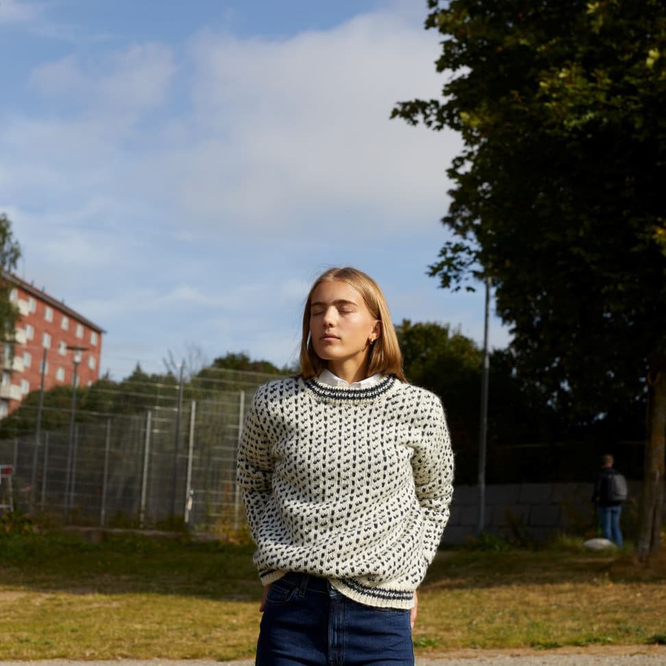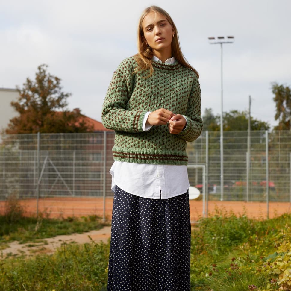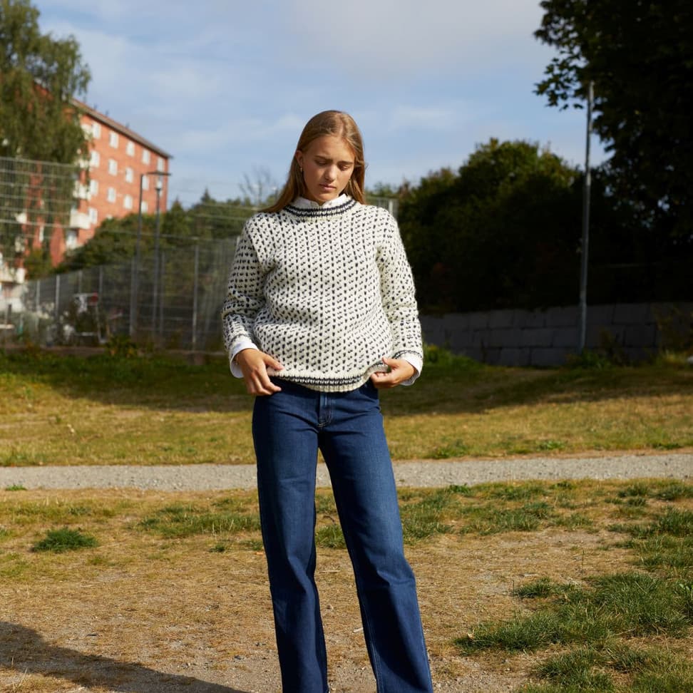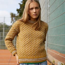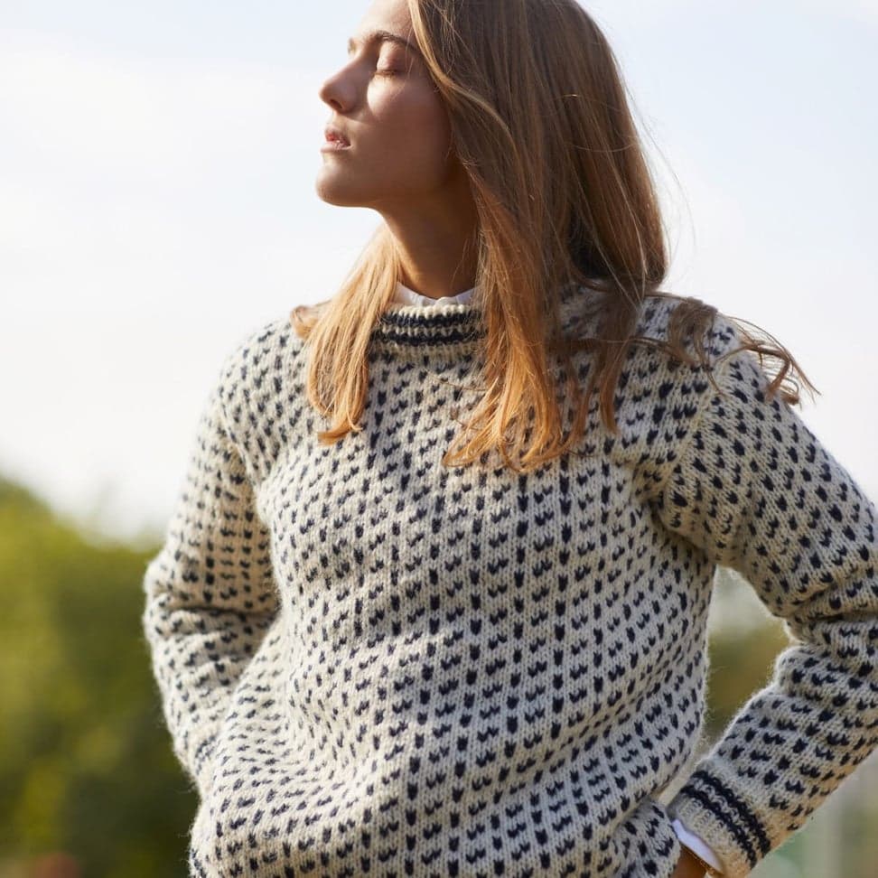 Islenderen er en klassisk genser med mønster i to farger. Genseren har rett fasong og isydde ermer og den strikkes nedenfra og opp. Ermene monteres i ermehullene med maskesting og halskanten plukkes opp til slutt.