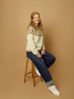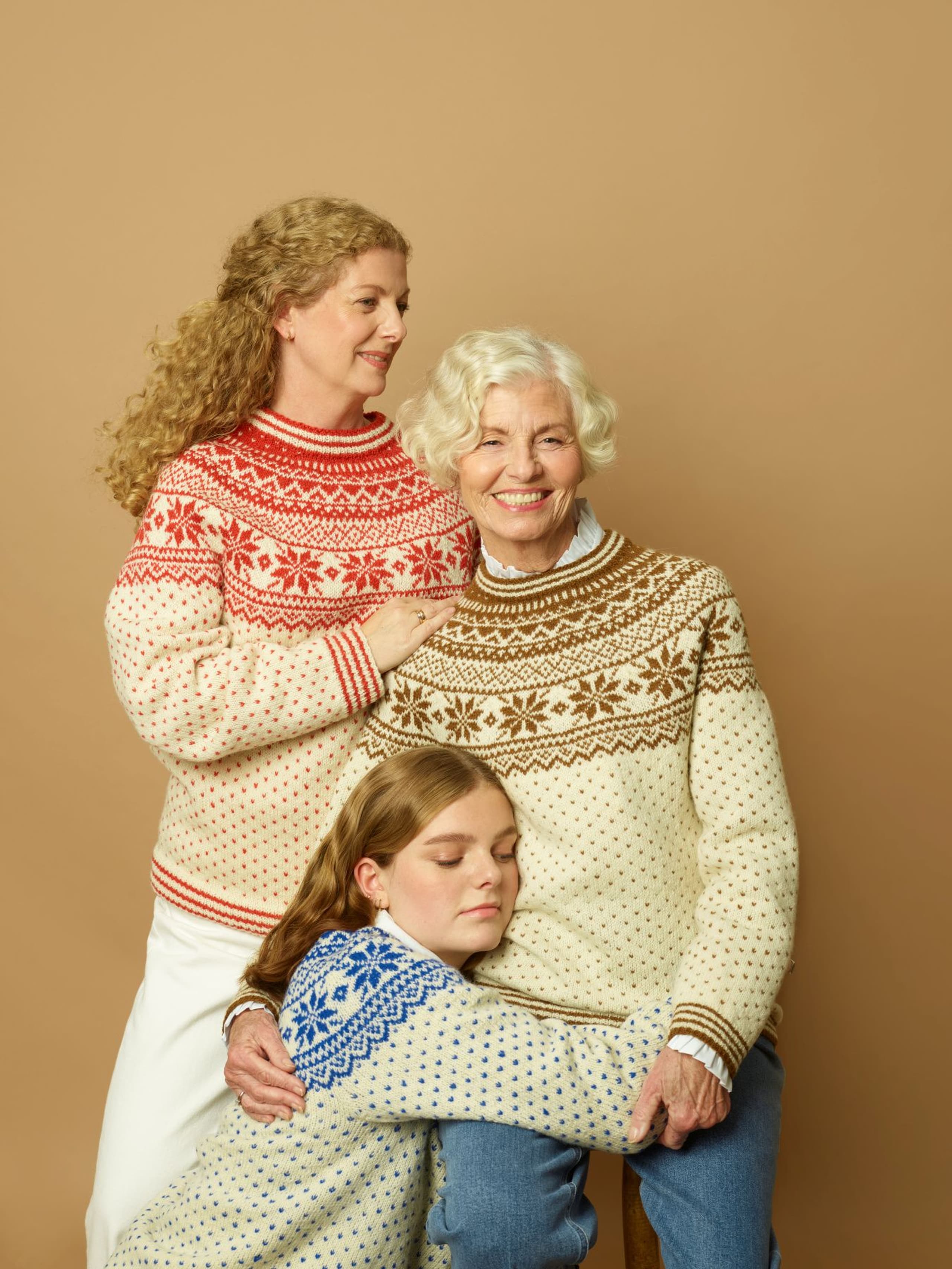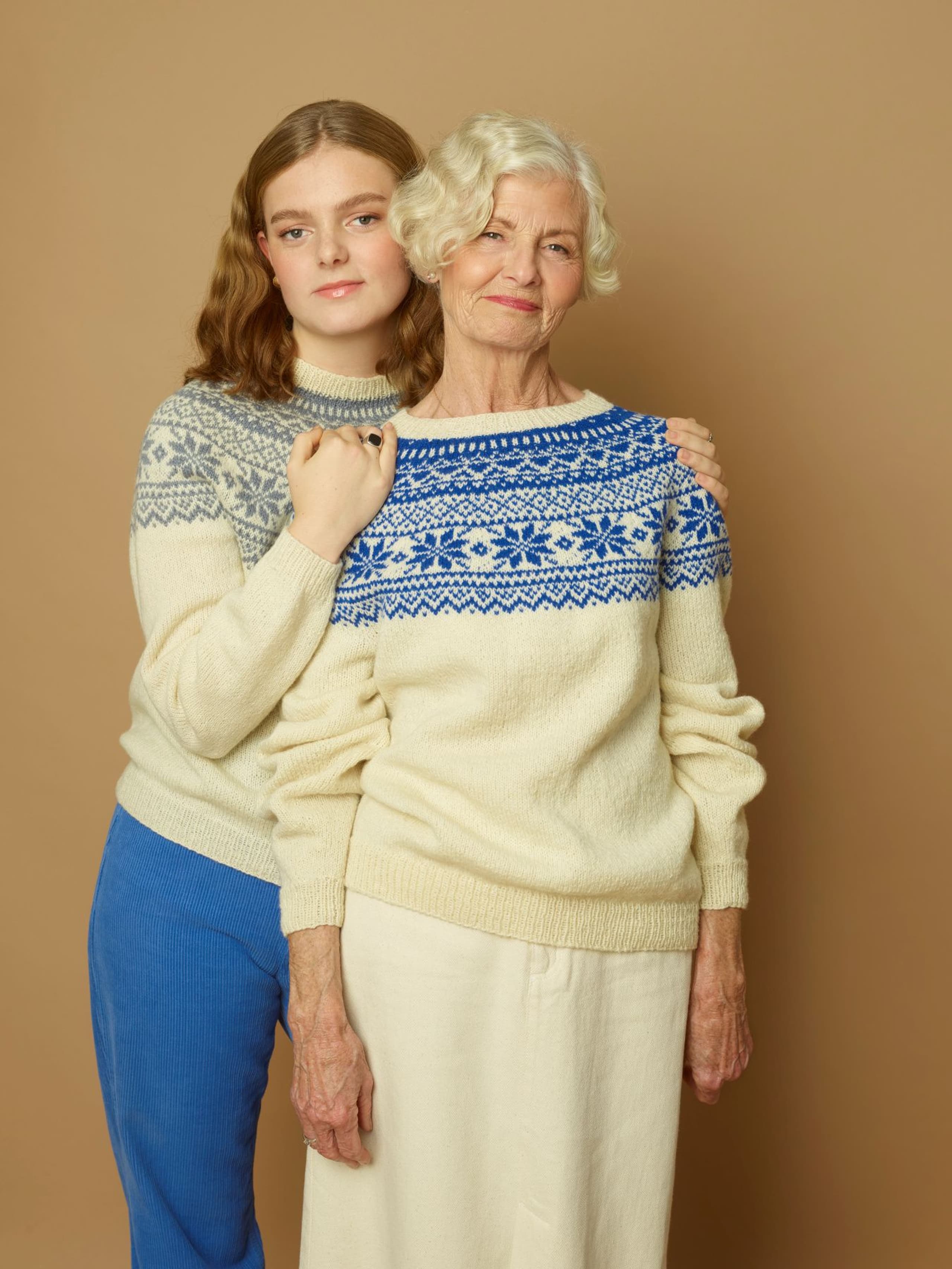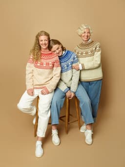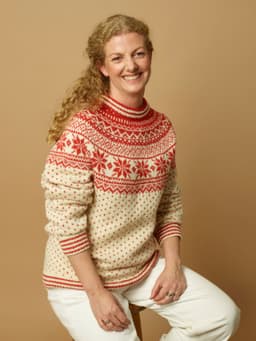 Genseren er rundfelt med flotte norske border på bærestykket. Velg alternativ A eller B: Alternativ A strikkes med striper i vrangbordene og lus på bol og ermer. Alternativ B er litt enklere – med mønster kun på bærestykket. Genseren strikkes nedenfra og opp. Etter sammenstrikkingen, starter man med noen få raglanfellinger, før man strikker rundfelling etter diagram.