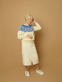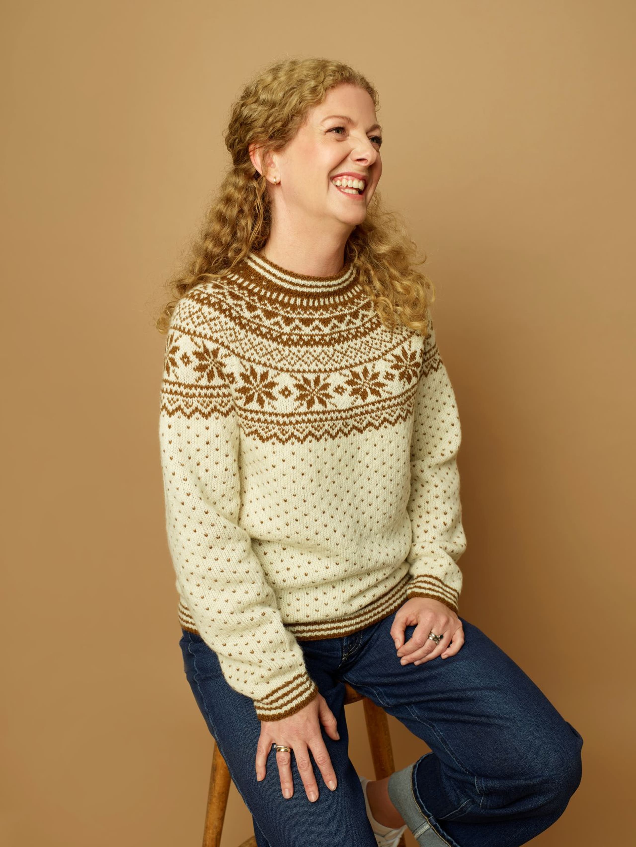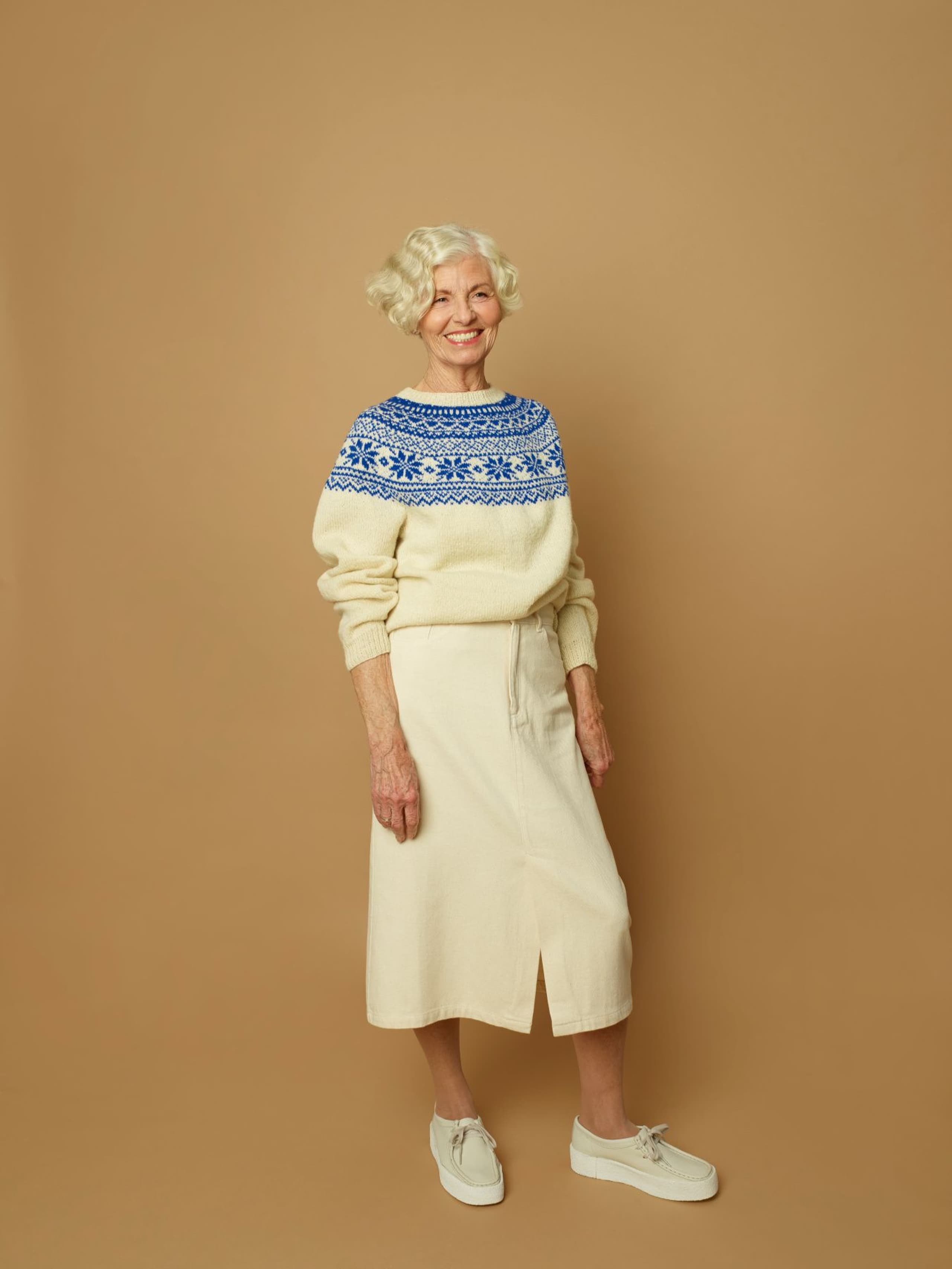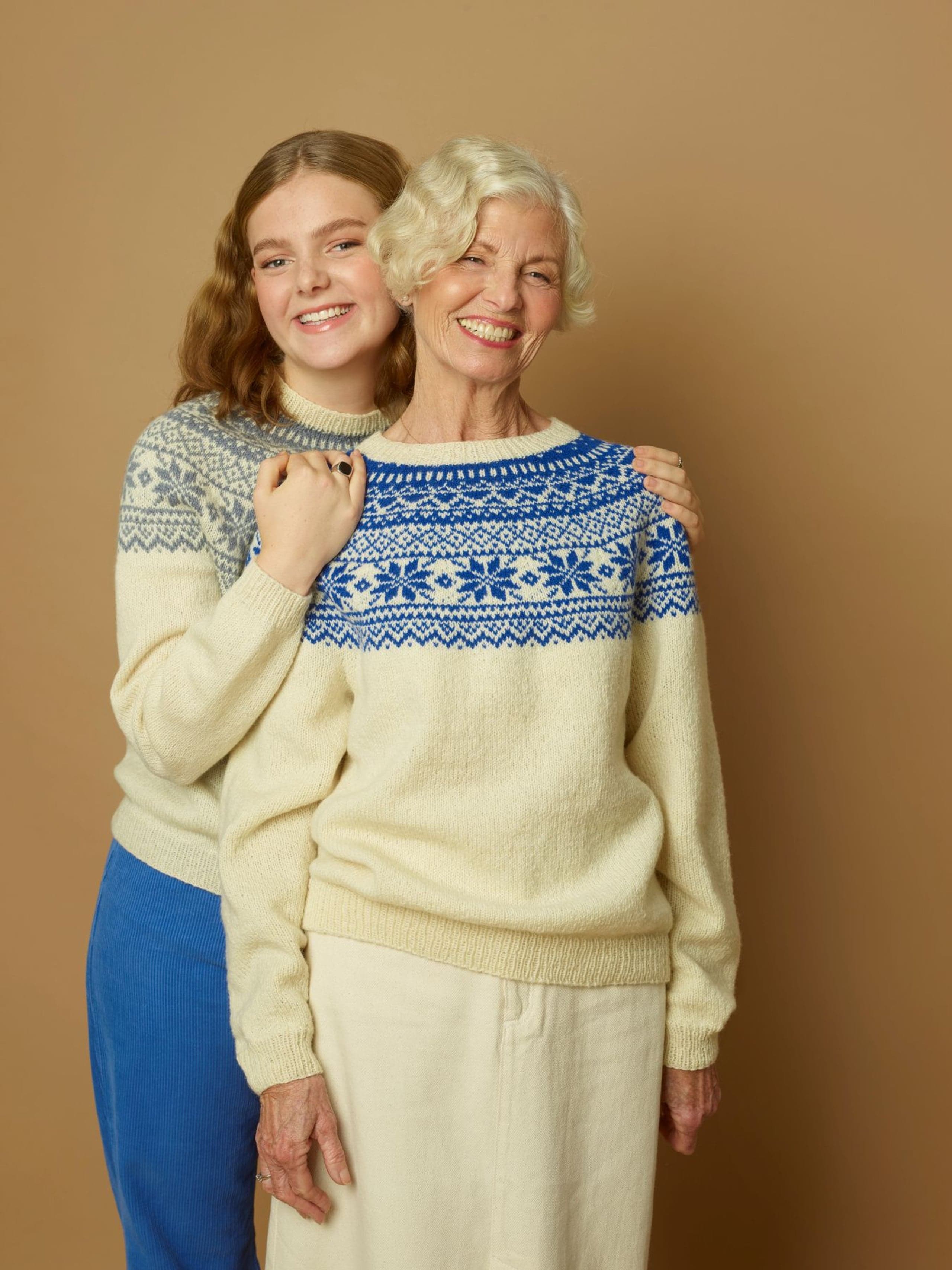 Genseren er rundfelt med flotte norske border på bærestykket. Velg alternativ A eller B: Alternativ A strikkes med striper i vrangbordene og lus på bol og ermer. Alternativ B er litt enklere – med mønster kun på bærestykket. Genseren strikkes nedenfra og opp. Etter sammenstrikkingen, starter man med noen få raglanfellinger, før man strikker rundfelling etter diagram.