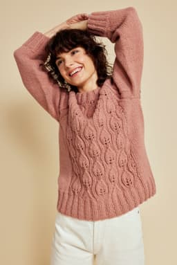 Genseren er strikket nedenfra og opp, med mønster midt foran. Den har glattstrikkede ermer med bred raglan, brede ribbekanter og dobbel hals. Genseren har en tenkt bevegelsesvidde på 8 cm.